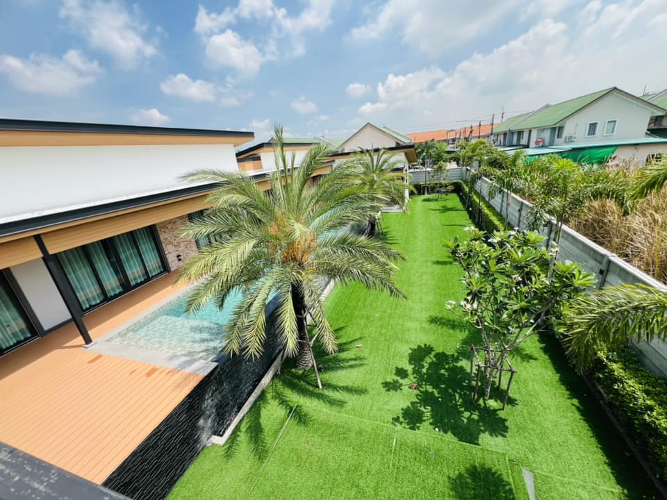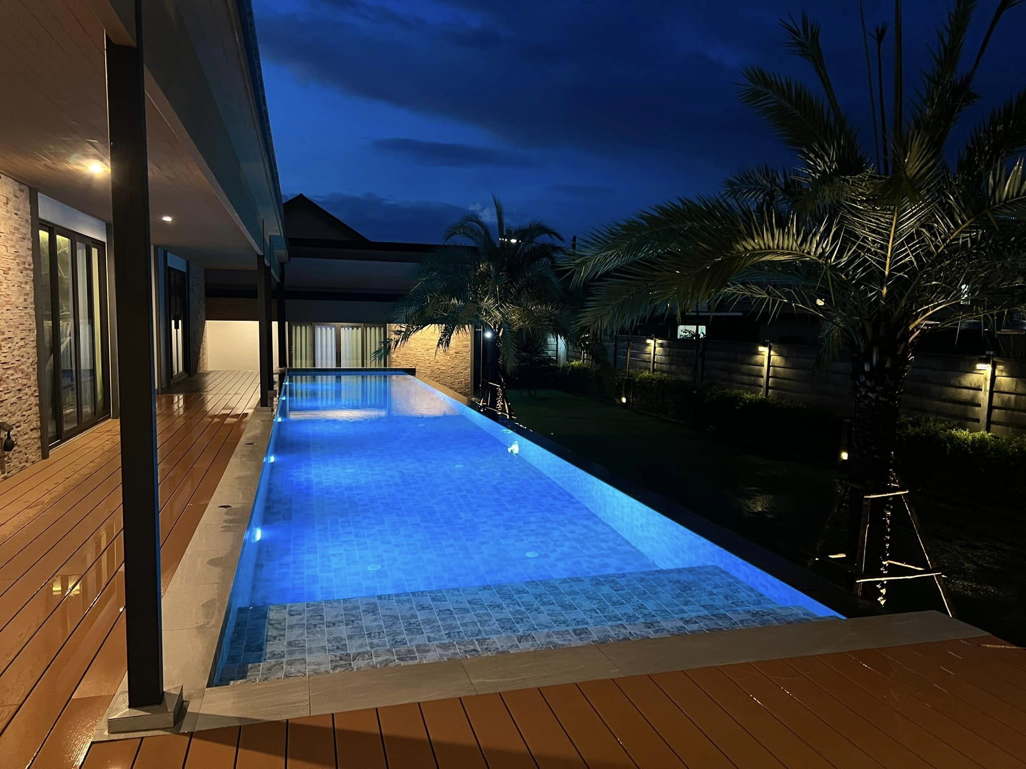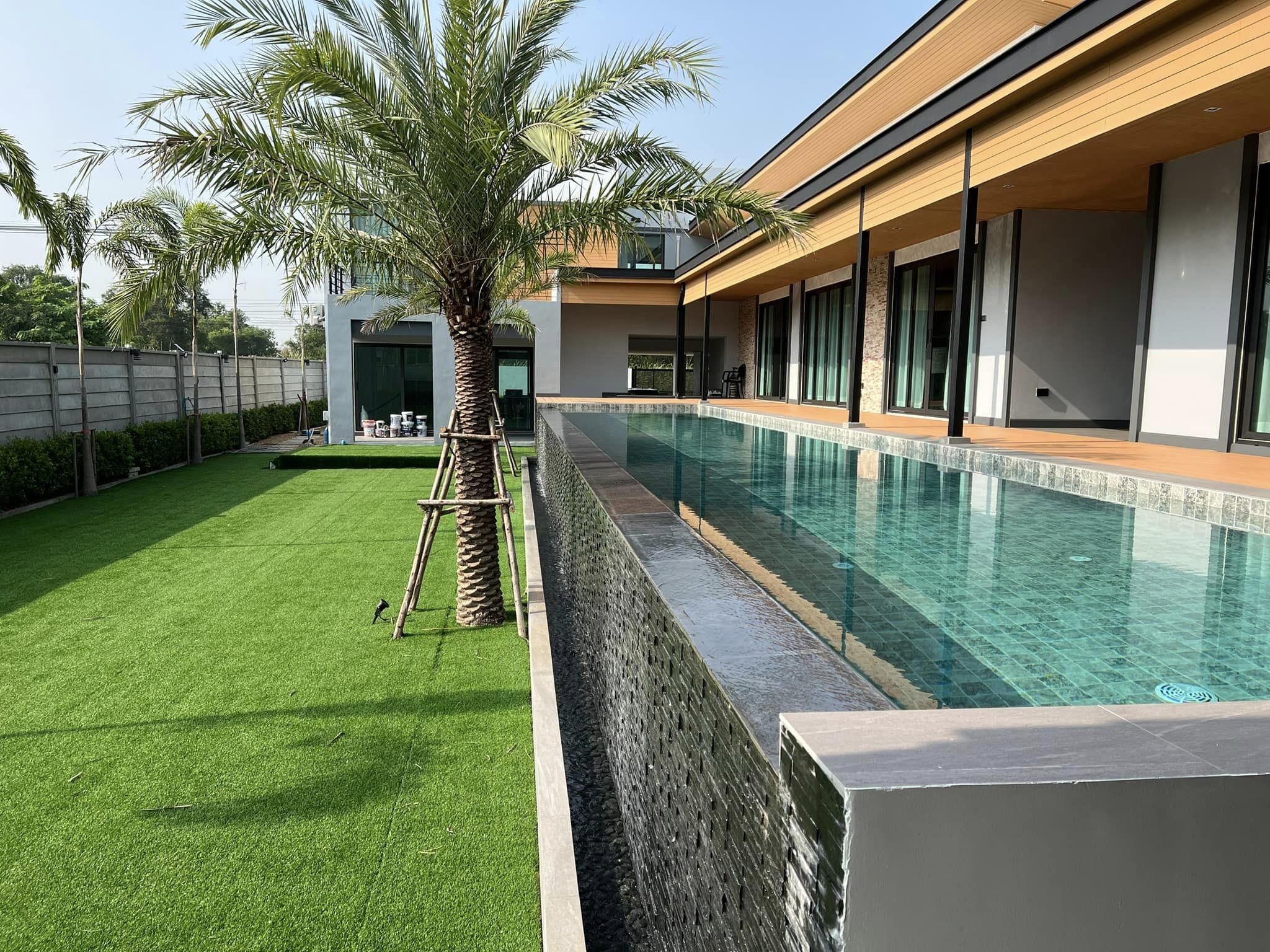 ห้องนั่งเล่น บาร์วิสกี้ ทานอาหาร 2 Pantry เฉลียงรอบสระน้ำ สระว่ายน้ำระบบเกลือขนาดใหญ่ยาว 18 เมตร จอดรถ 7 คัน สวนสนามหญ้าหน้าบ้าน สวนหญ้าเทียมข้างสระน้ำ พื้นที่ใช้สอย 680 ตรม.