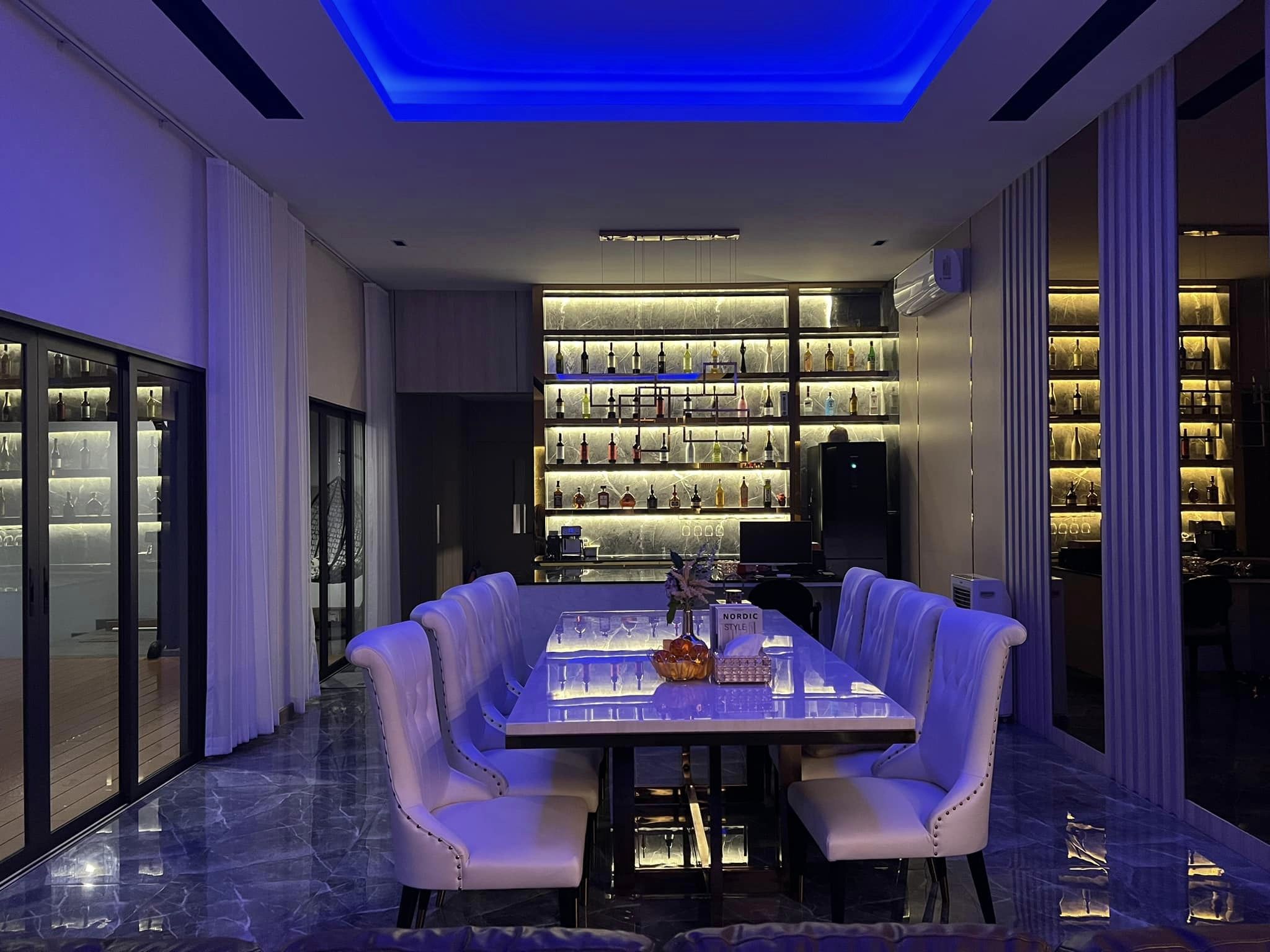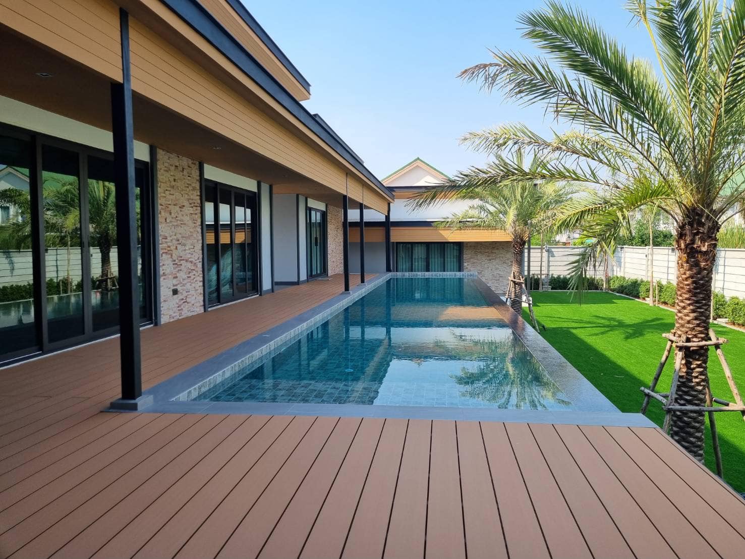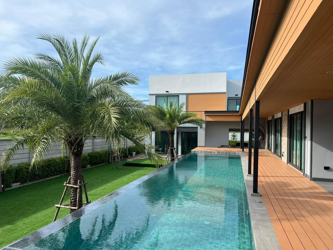 ห้องนั่งเล่น บาร์วิสกี้ ทานอาหาร 2 Pantry เฉลียงรอบสระน้ำ สระว่ายน้ำระบบเกลือขนาดใหญ่ยาว 18 เมตร จอดรถ 7 คัน สวนสนามหญ้าหน้าบ้าน สวนหญ้าเทียมข้างสระน้ำ พื้นที่ใช้สอย 680 ตรม.