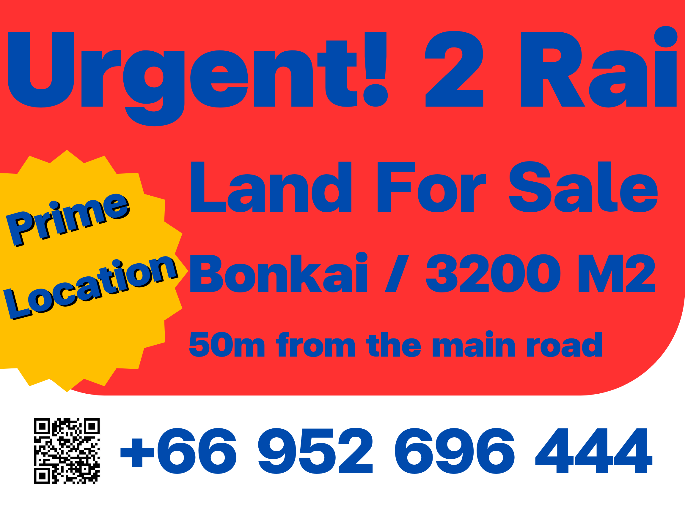 FOR SALE: 2 Rai (3200 m2) Flat land Prime location "Bonkai Road"