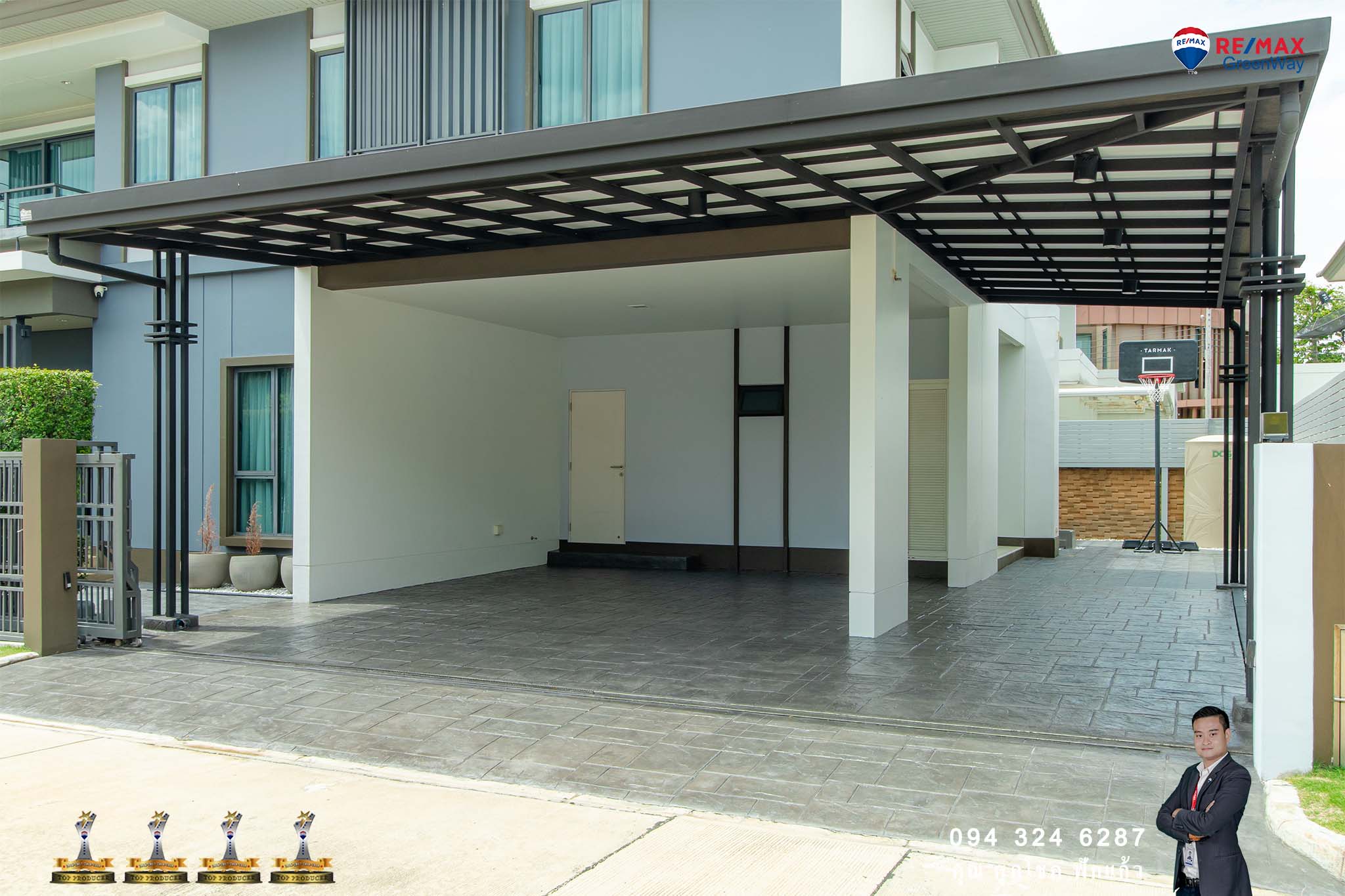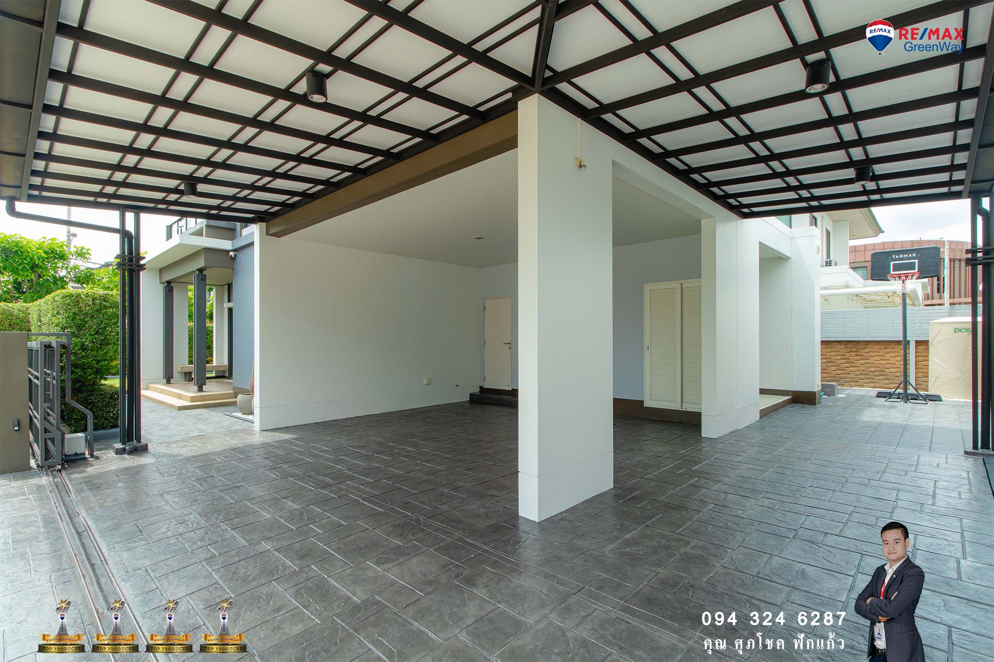 ตกแต่ง ผ้าม่าน เครื่องทำน้ำอุ่น และเครื่องปรับอากาศ พื้นโรงจอดรถหินแกะลาย เสาเข็มไมโครไพล์อย่างดีโรงจอดรถ รั้วระแนงบังตา