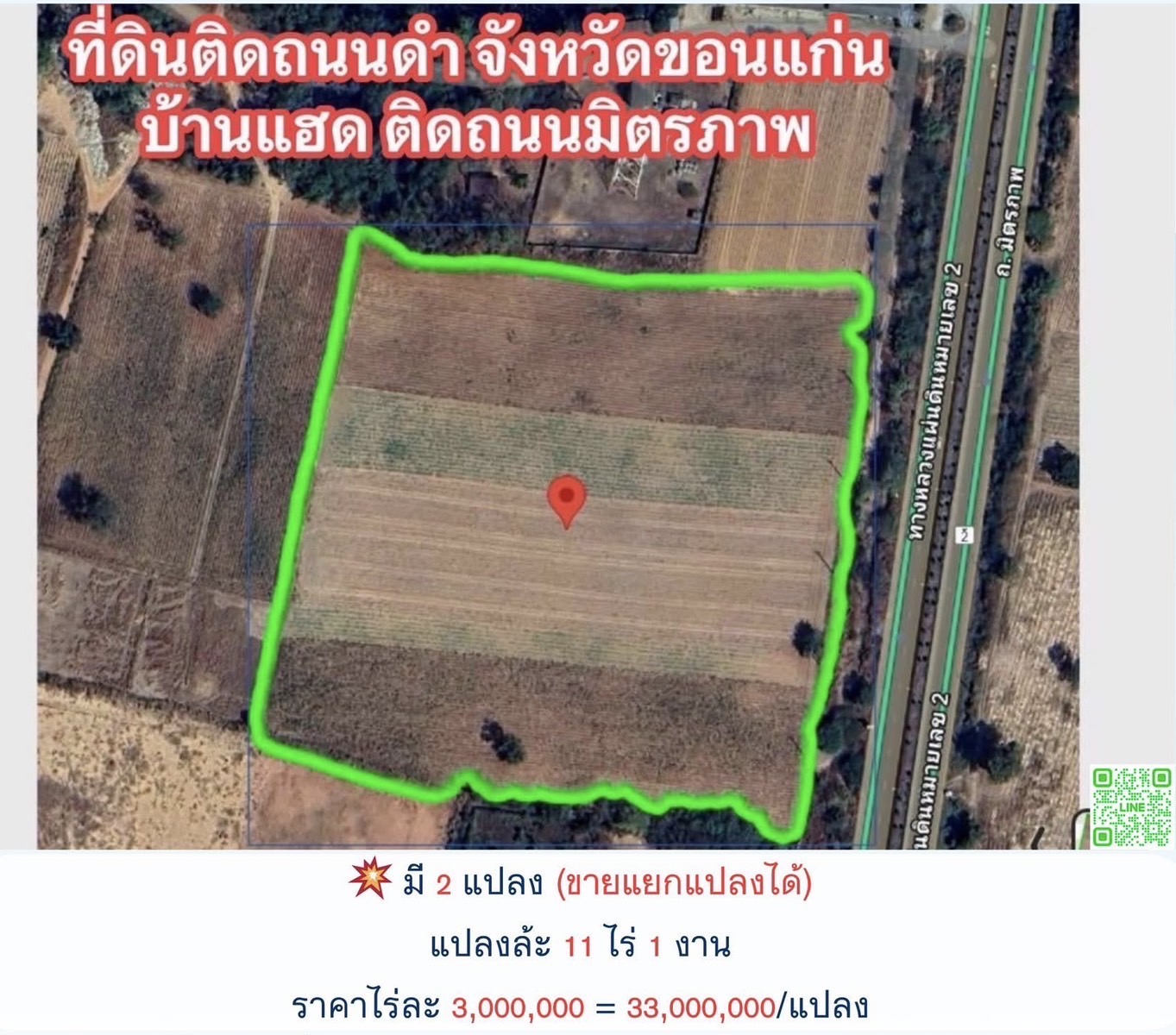 ขายที่ดิน 12 ไร่ ติดถนนมิตรภาพ บ้านแฮด ขอนแก่น ทำเลทอง เหมาะลงทุน
