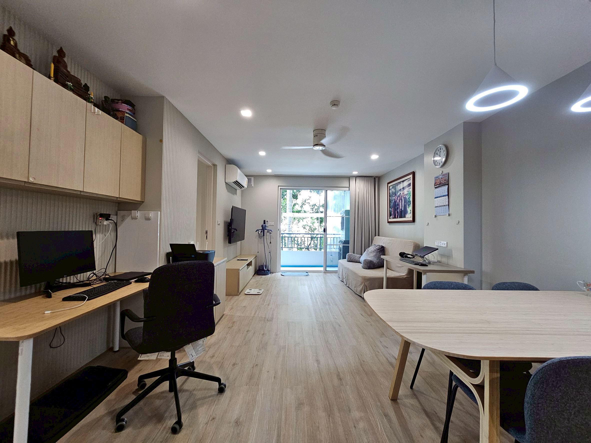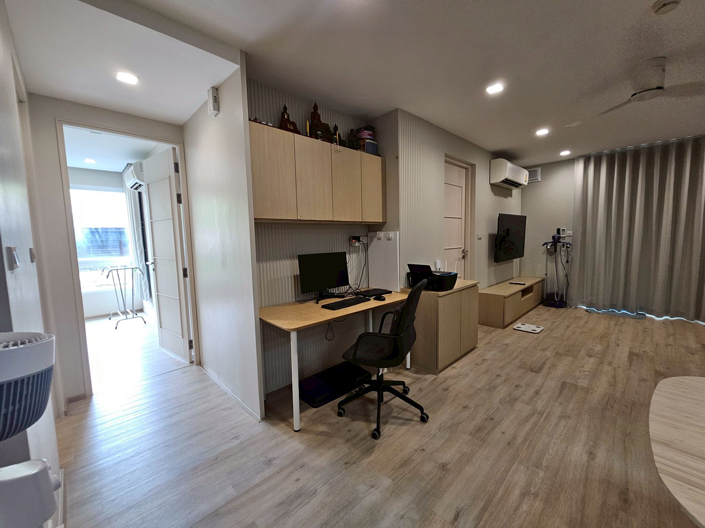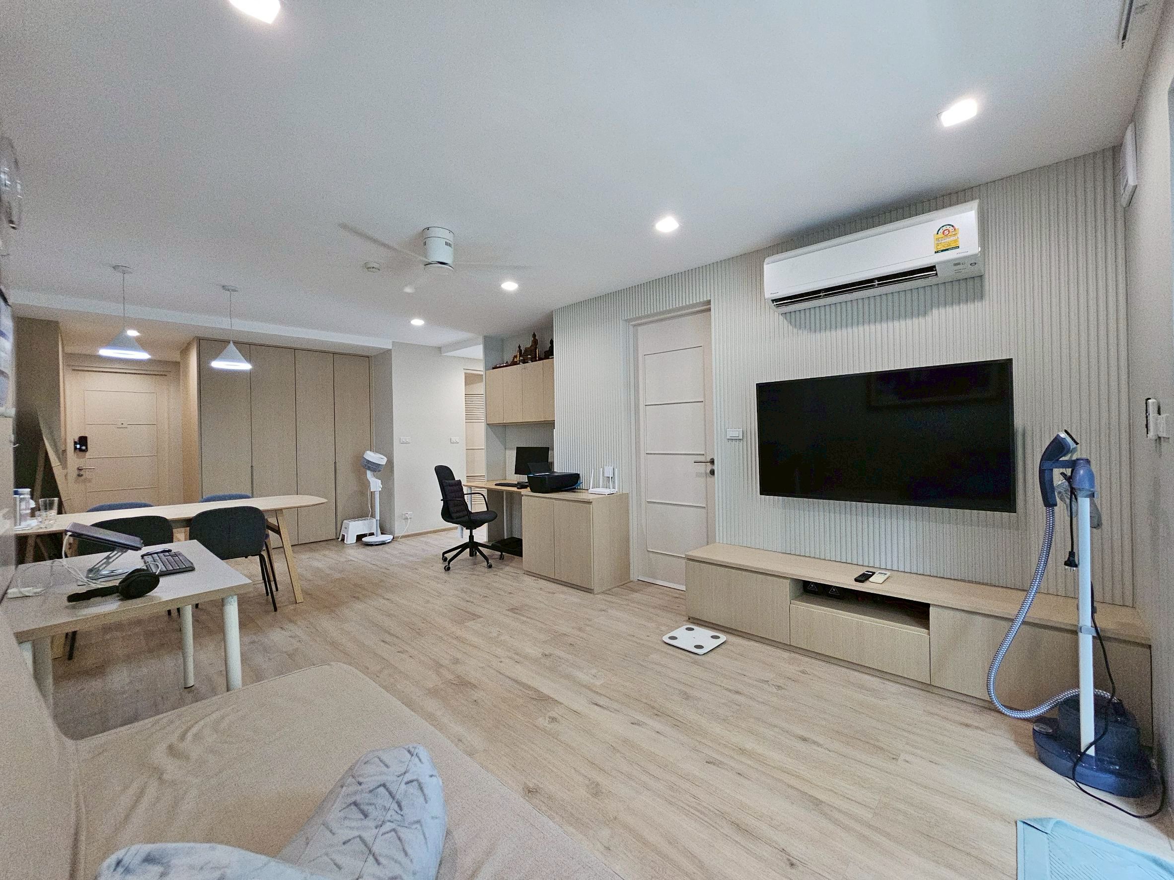 ห้องนั่งเล่นกว้างขวาง พร้อมมุมทำงาน มีโต๊ะทำงาน 2 ตัว สำหรับ Work From Home