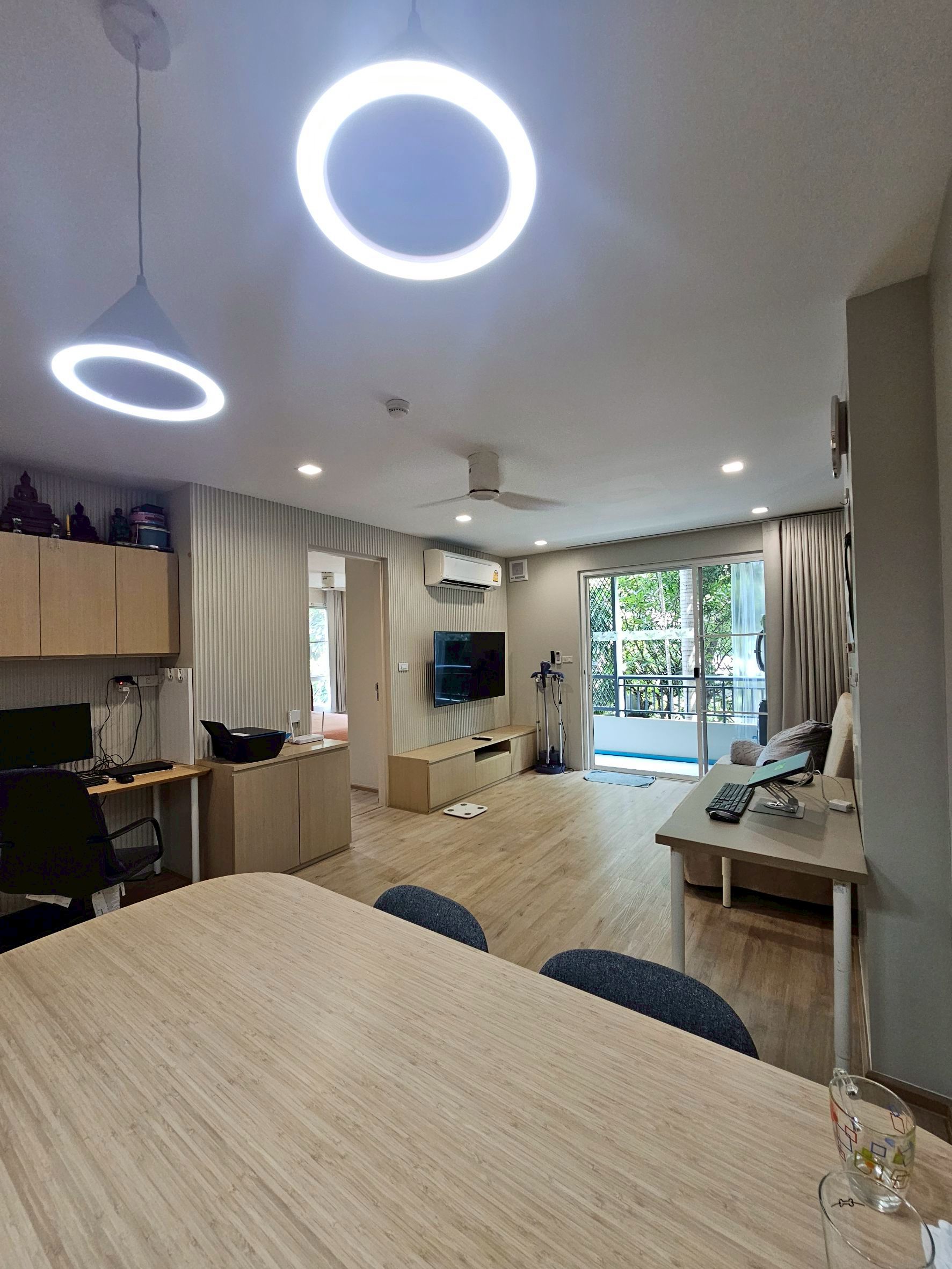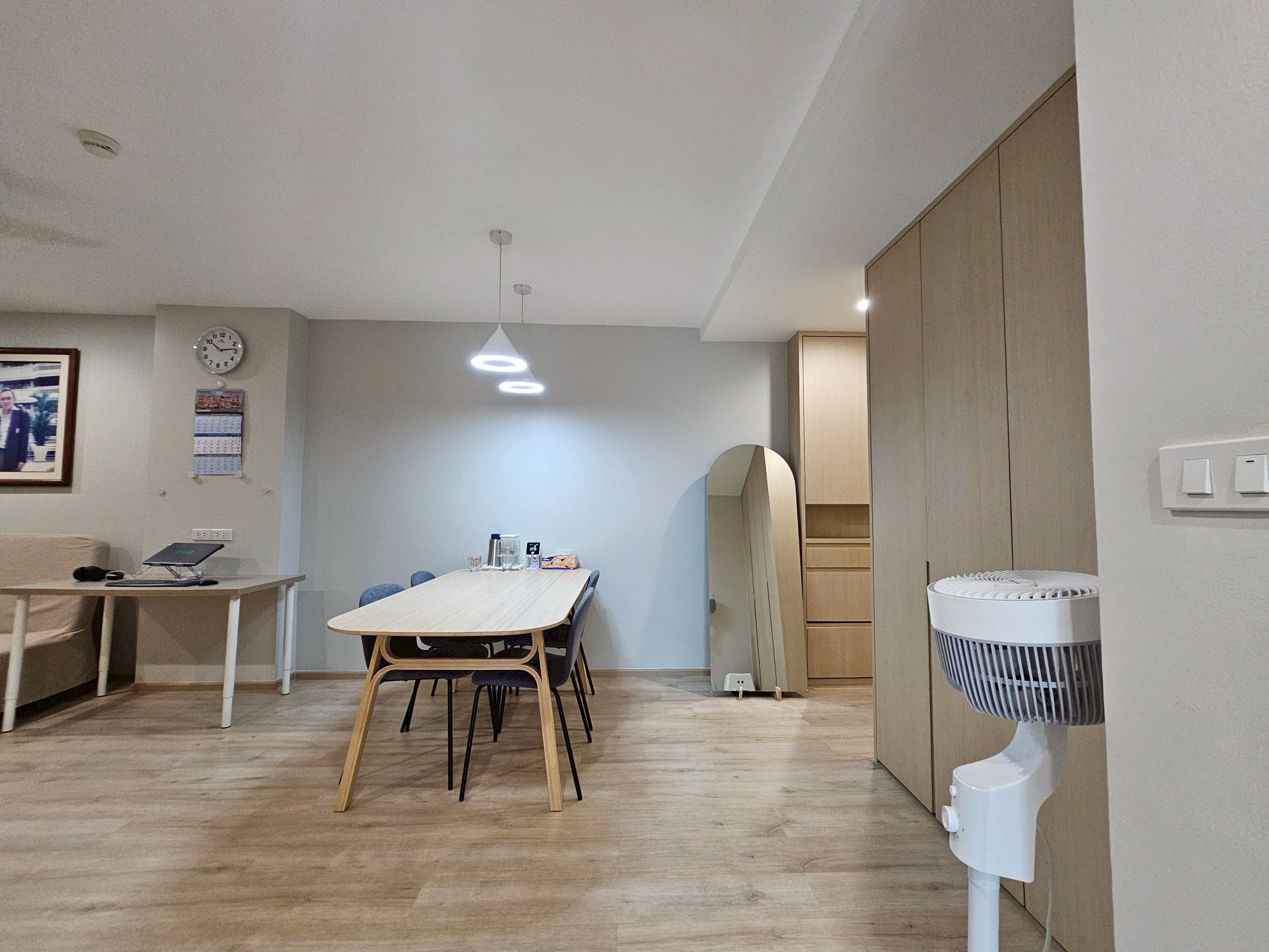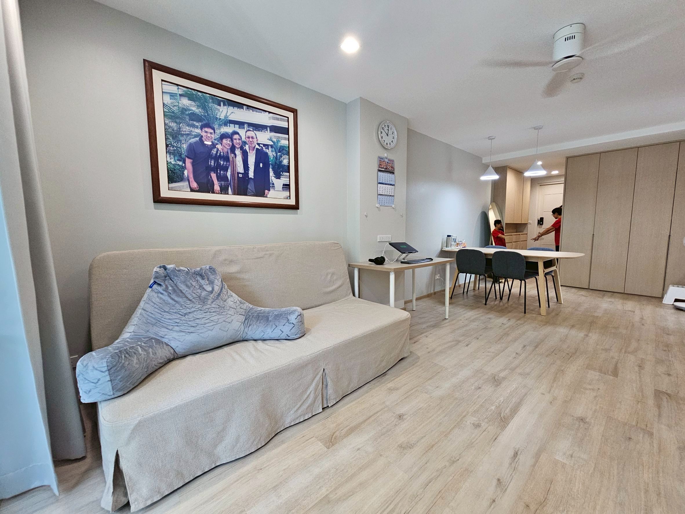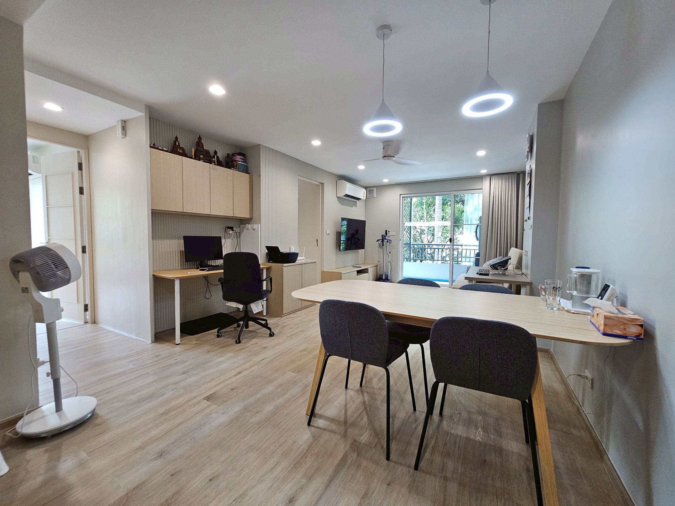 ห้องนั่งเล่นกว้างขวาง พร้อมมุมทำงาน มีโต๊ะทำงาน 2 ตัว สำหรับ Work From Home