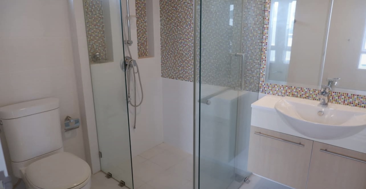 • ห้องน้ำสุขภัณฑ์ครบ พร้อมอ่างอาบน้ำและฉากกั้นกระจกนิรภัย
