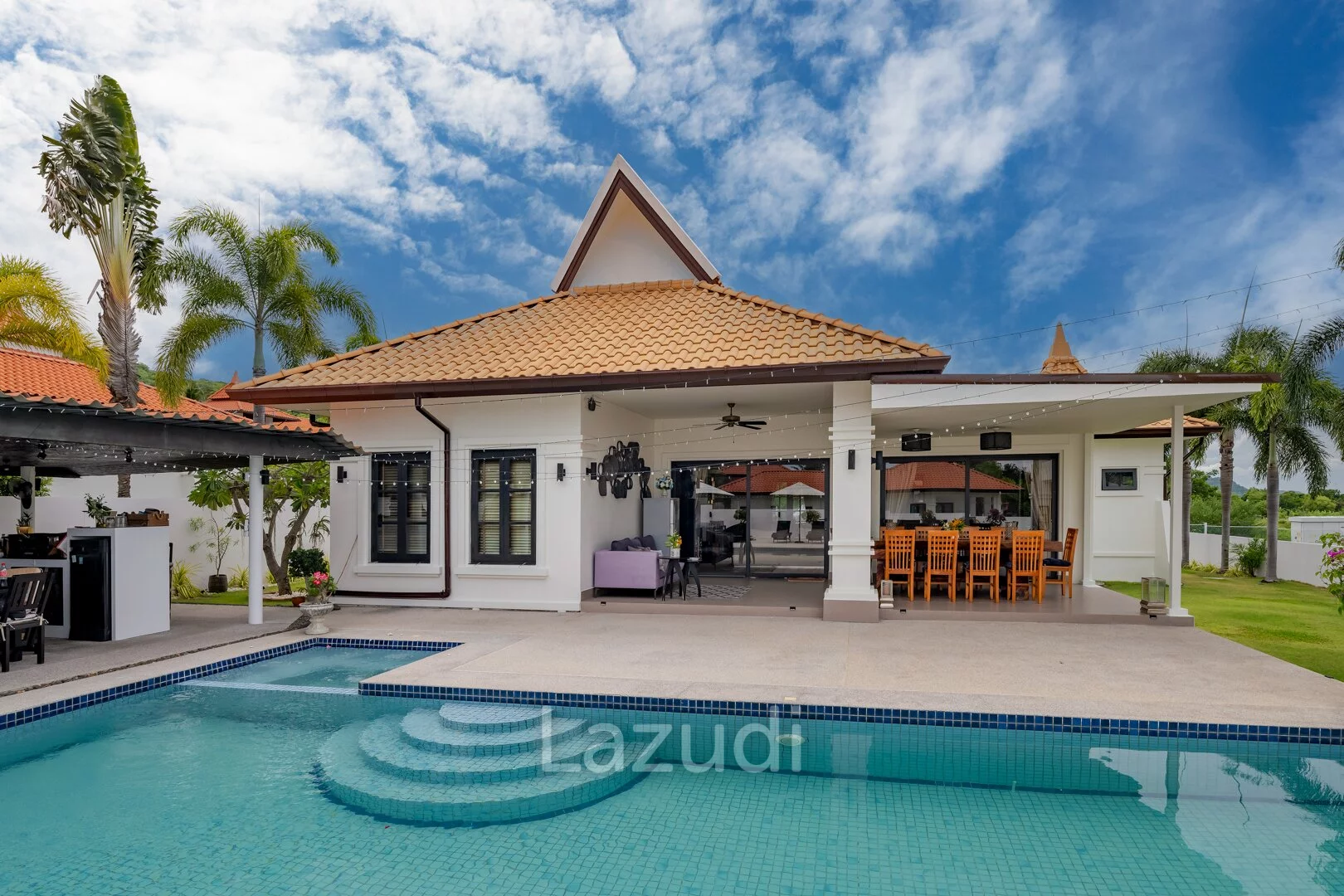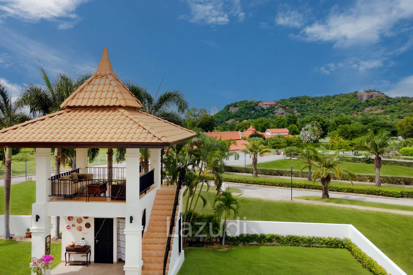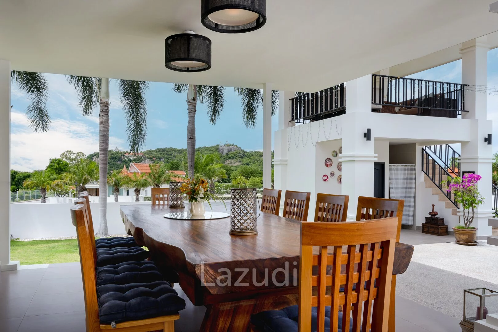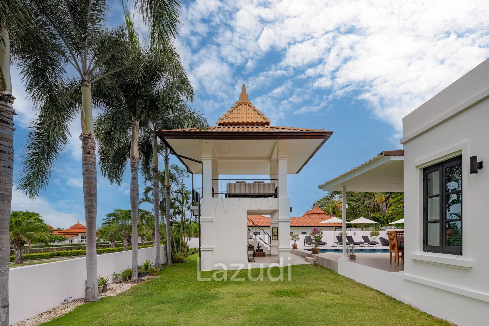 English: Discover the ultimate in tropical luxury at Banyan Residences one of Hua Hin’s most prestigious addresses. This stunning 5-bedroom Bali-style pool villa is situated on an exceptionally large land plot offering unmatched privacy and breathtaking panoramic mountain views. The architectural design seamlessly blends indoor and outdoor living featuring high ceilings expansive open-plan areas and top-tier finishes throughout. Complete with a large private swimming pool a traditional Bale (pavilion) and lush landscaped gardens this residence is a sanctuary of peace and sophistication. Ideally located near the world-renowned Banyan Golf Club it represents a rare opportunity to own a world-class estate in Hua Hin.