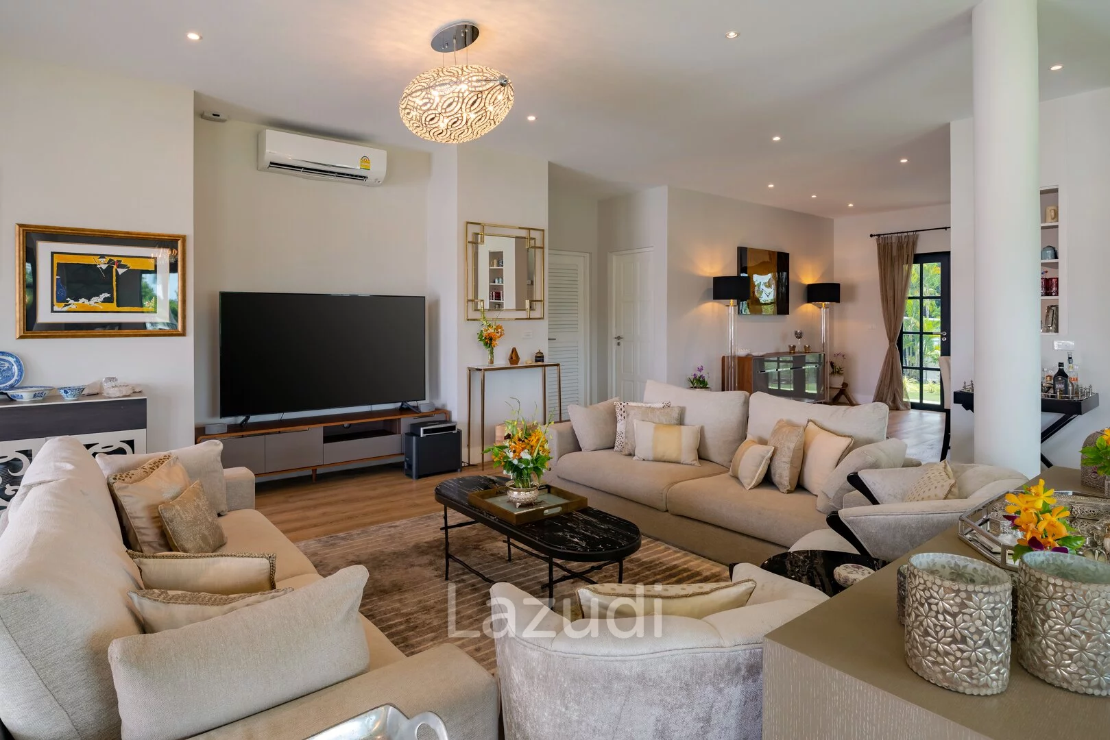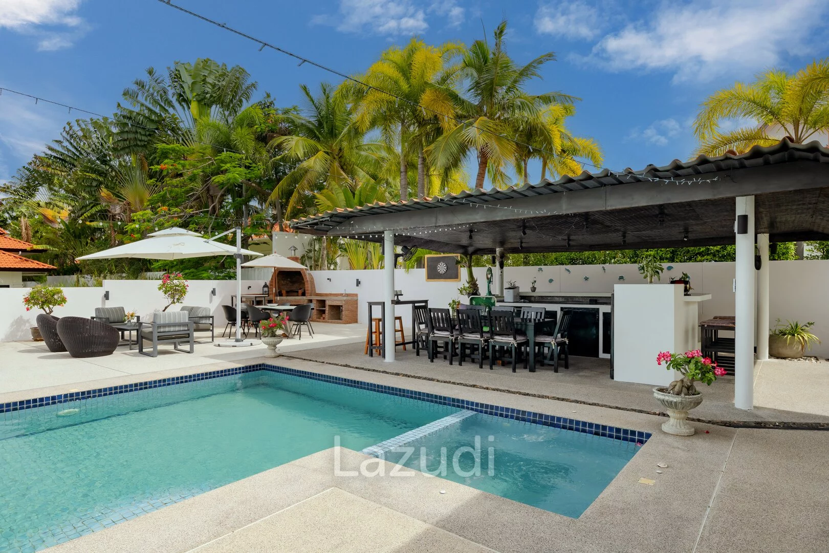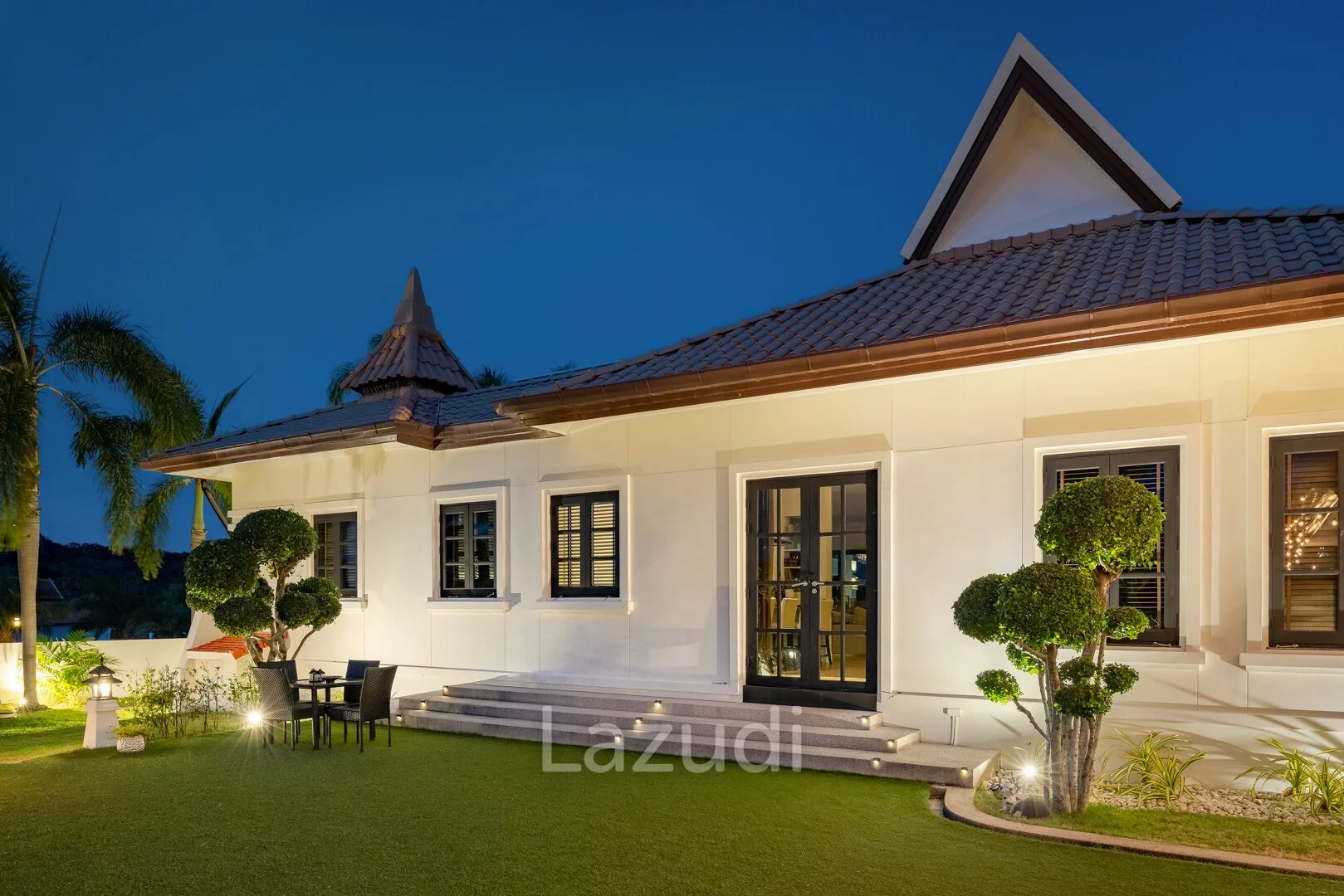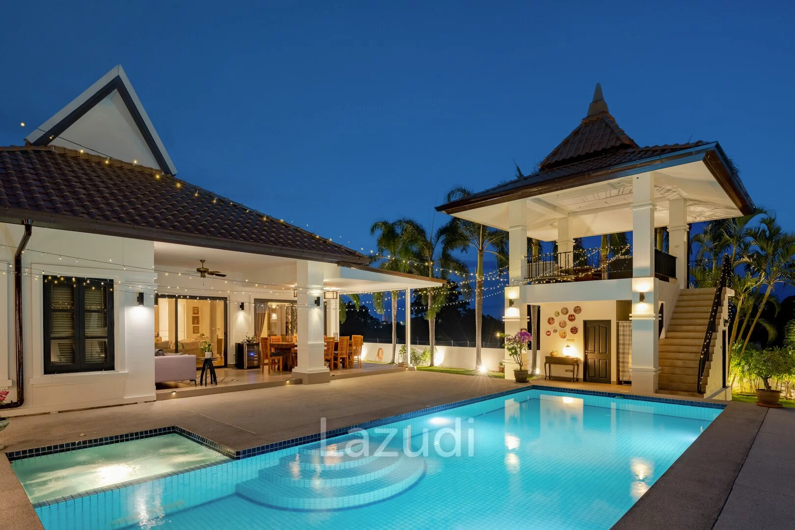English: Discover the ultimate in tropical luxury at Banyan Residences one of Hua Hin’s most prestigious addresses. This stunning 5-bedroom Bali-style pool villa is situated on an exceptionally large land plot offering unmatched privacy and breathtaking panoramic mountain views. The architectural design seamlessly blends indoor and outdoor living featuring high ceilings expansive open-plan areas and top-tier finishes throughout. Complete with a large private swimming pool a traditional Bale (pavilion) and lush landscaped gardens this residence is a sanctuary of peace and sophistication. Ideally located near the world-renowned Banyan Golf Club it represents a rare opportunity to own a world-class estate in Hua Hin.