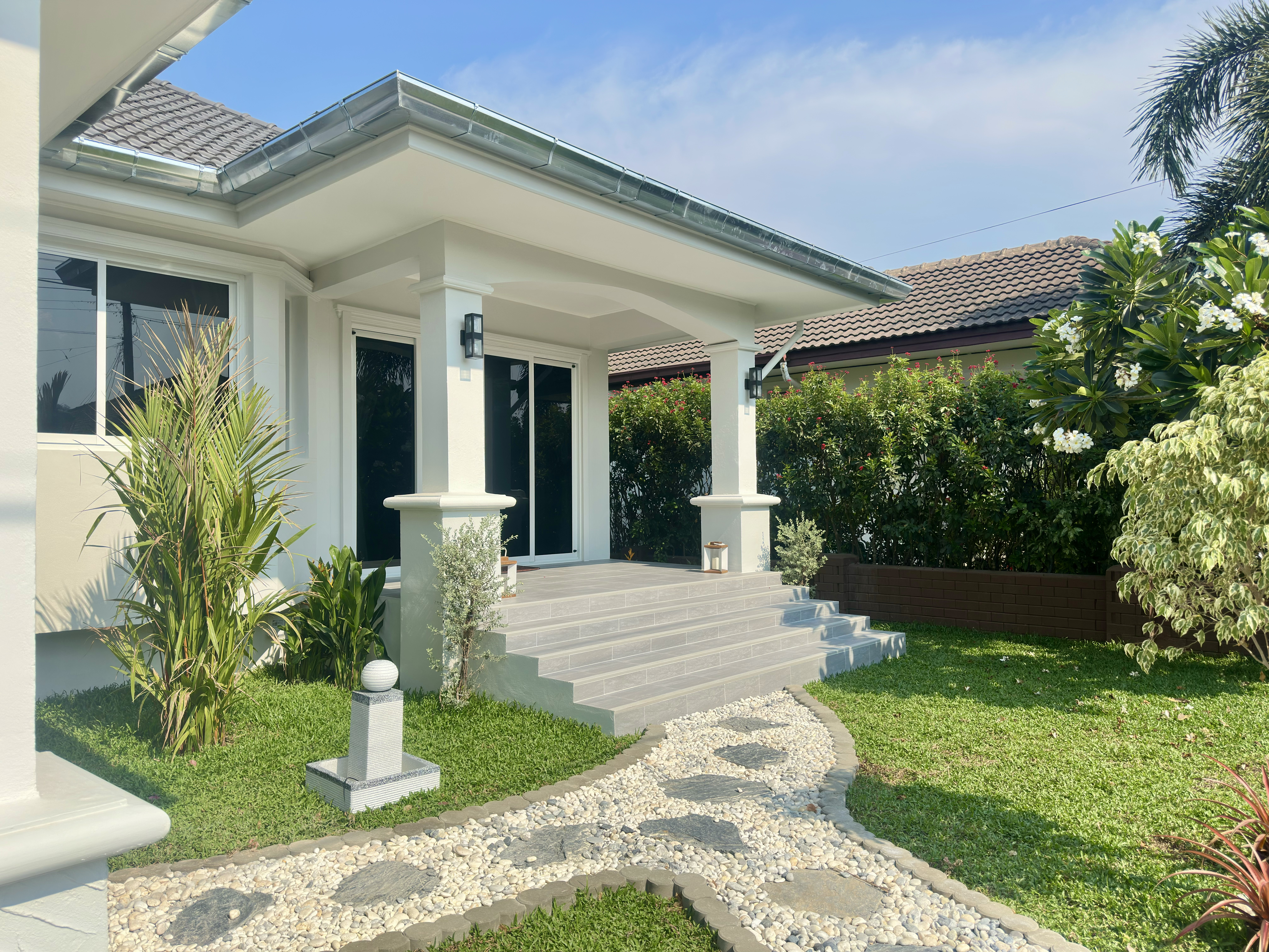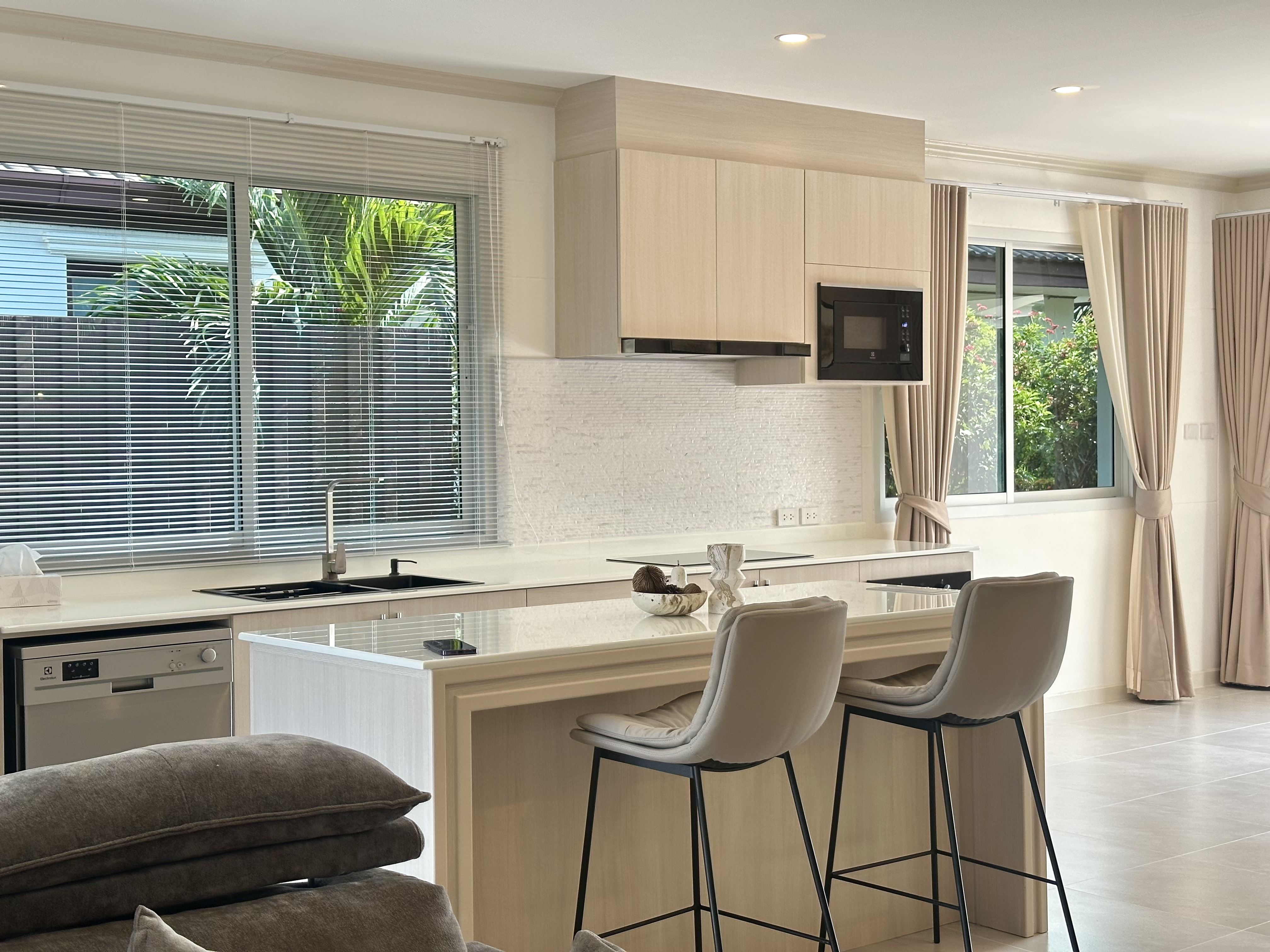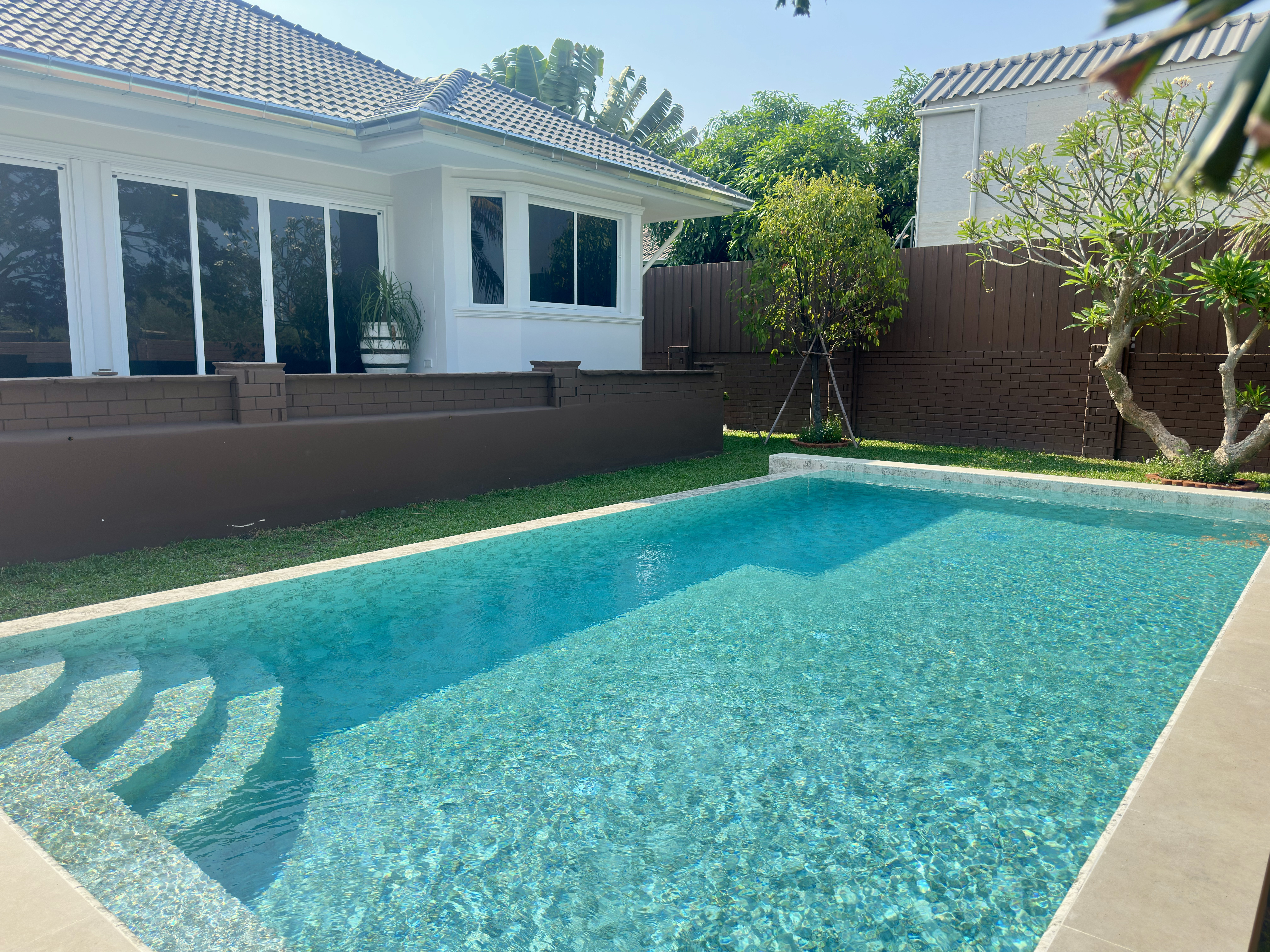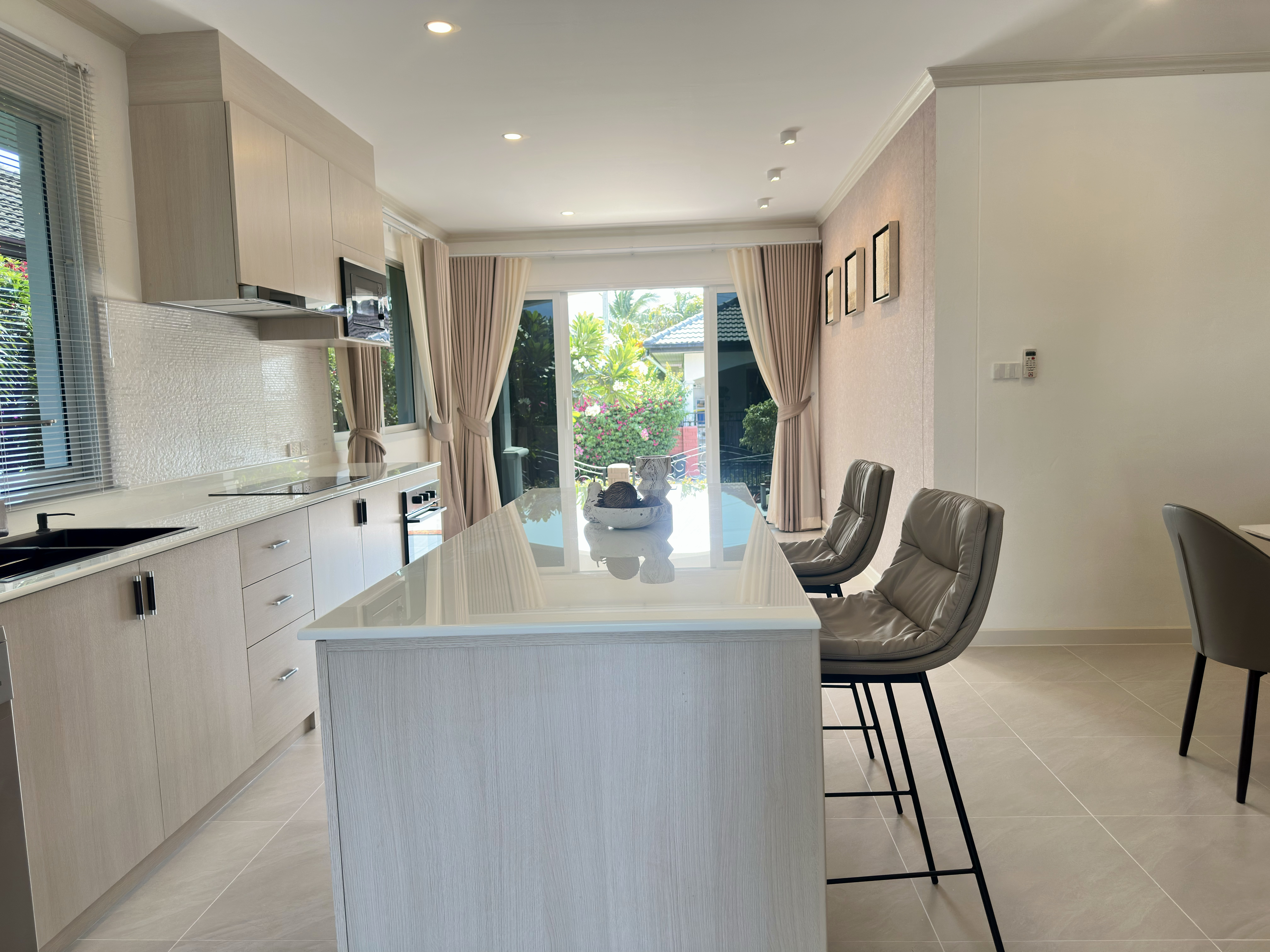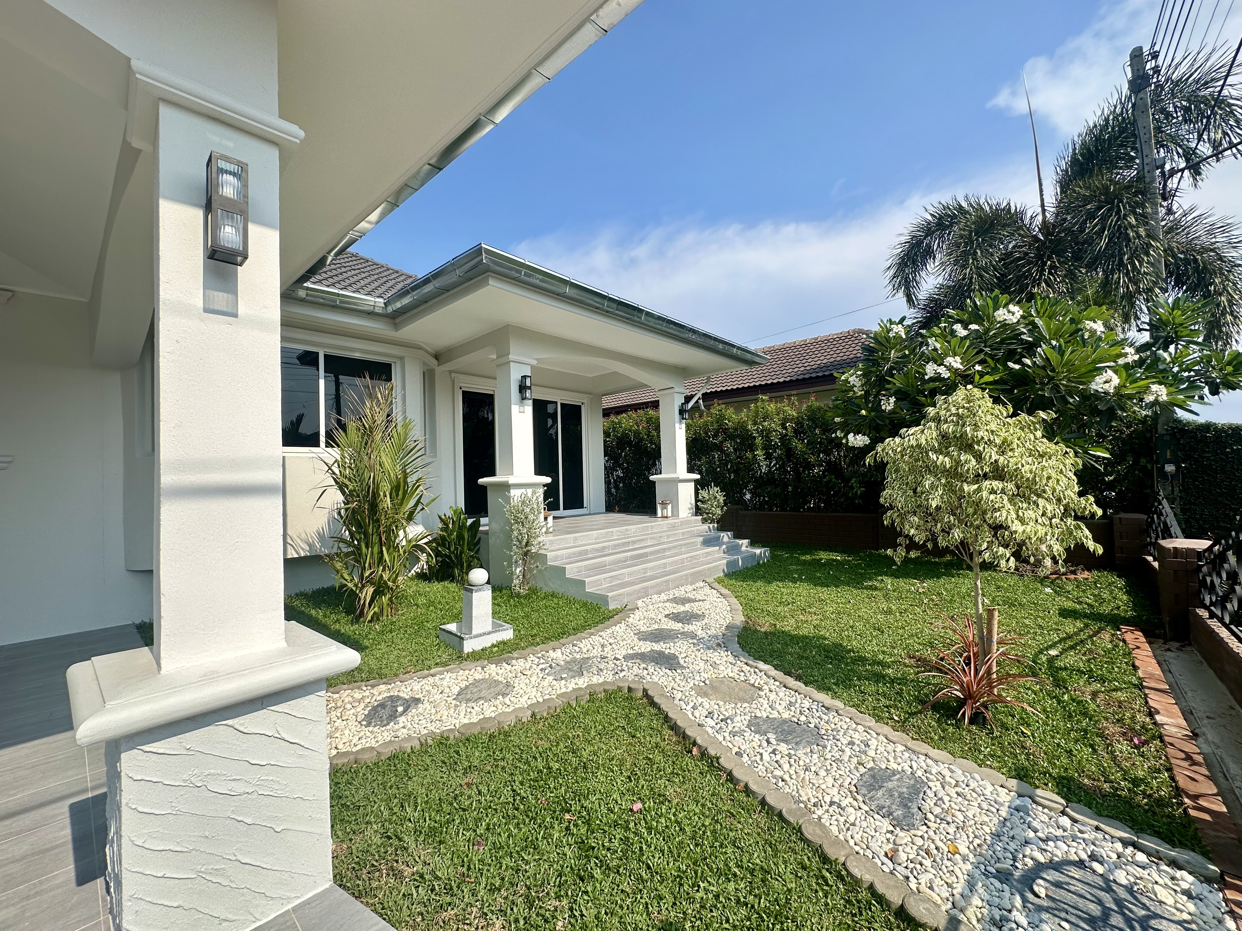 English: [Open House April 18 2026] Experience this stunningly renovated private pool villa in the prestigious Laguna Hua Hin Village Soi 102. This home has undergone a complete transformation including brand-new electrical plumbing and drainage systems. The interior features a spacious open-plan living area with a ceiling-mounted AC a high-end European kitchen with premium appliances (Electrolux) and modern bathrooms with all-new sanitary ware. Outdoor highlights include a newly built 4x8m saltwater overflow pool and a beautifully landscaped garden. Located only 3km from the beach and minutes from Bluport Resort Mall this villa offers the ultimate luxury lifestyle in a prime central location.