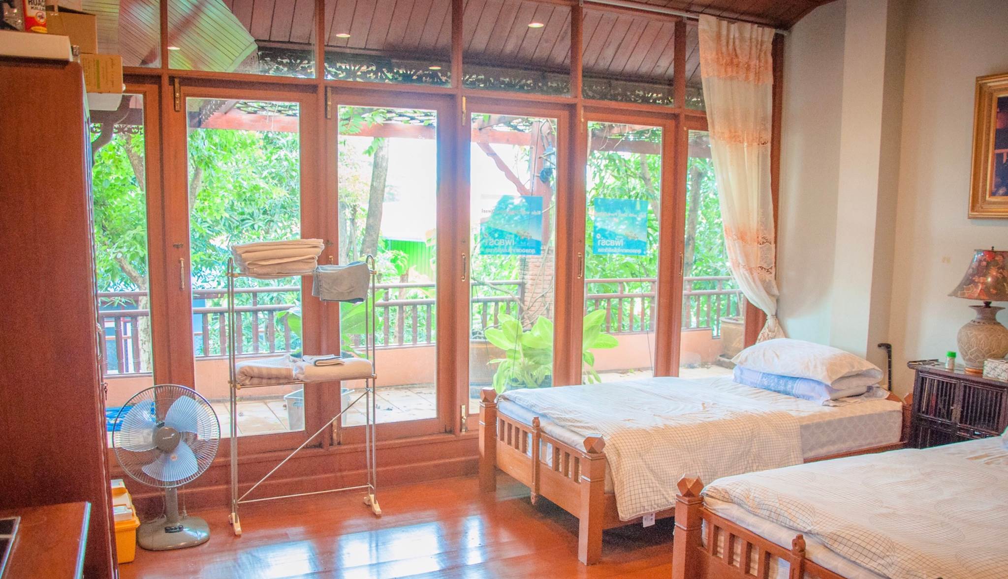 - บ้านหลักไม้สักทองแท้ 2 ชั้น มี 3 ห้องนอนหลัก + ห้องนอนใต้หลังคา 1 ห้อง มีหอคอยไว้นั่งเล่น ชั้น 3 แยกจากตัวบ้านหลัก + ห้องครัวบนล่าง 2 ห้อง ห้องโถงใหญ่ 2 ห้อง ลานกว้างชั้นสองโล่งหันหน้ารับลมออกทางแม่น้ำน้อย ส่วนชั้นล่างห้องโถงใหญ่เปิดโล่งจัดงานเลี้ยงรับรองคนสบายได้ 30 คน + - (มีติดแอร์ทุกห้อง)