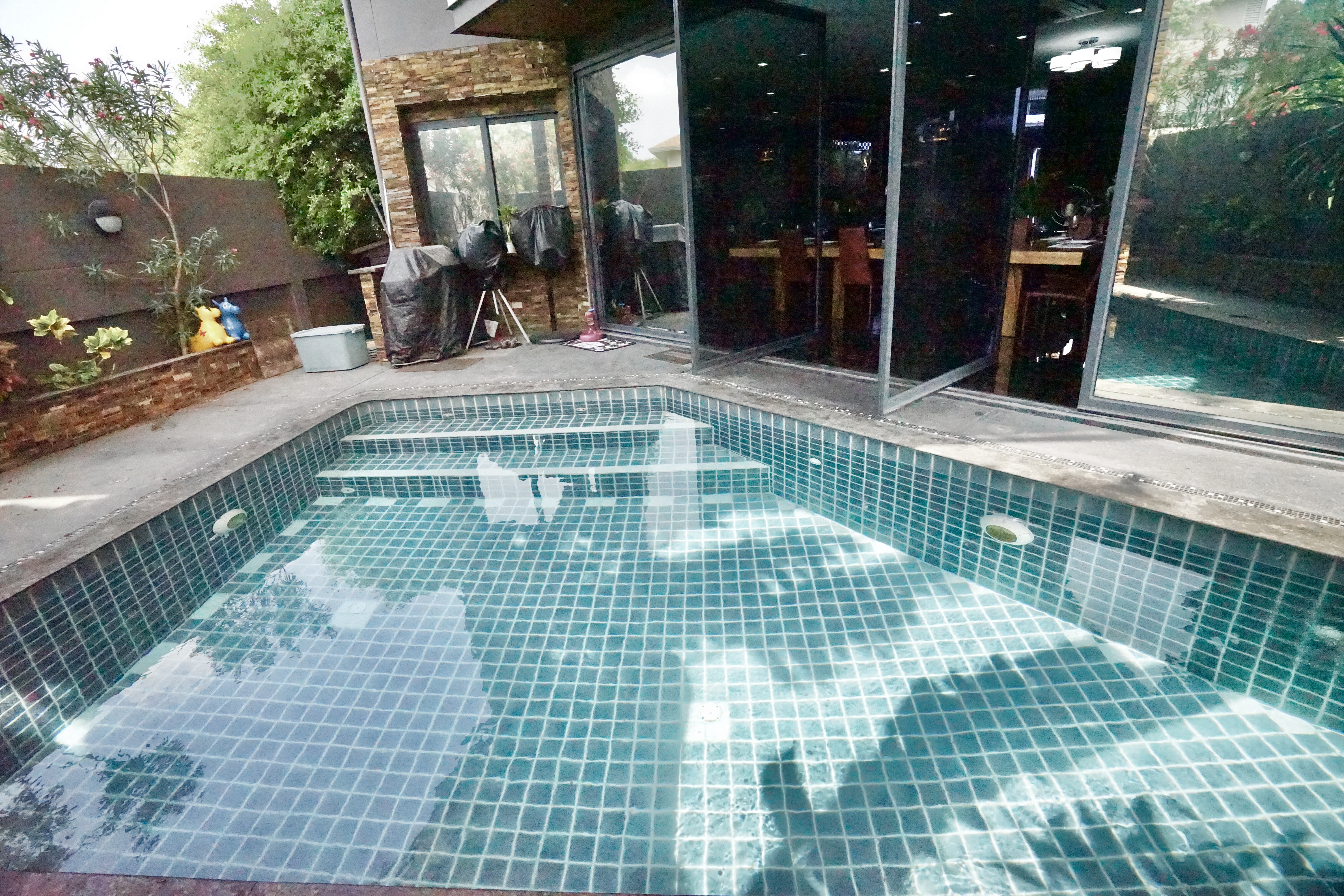 - มีสระว่ายน้ำหลังบ้าน