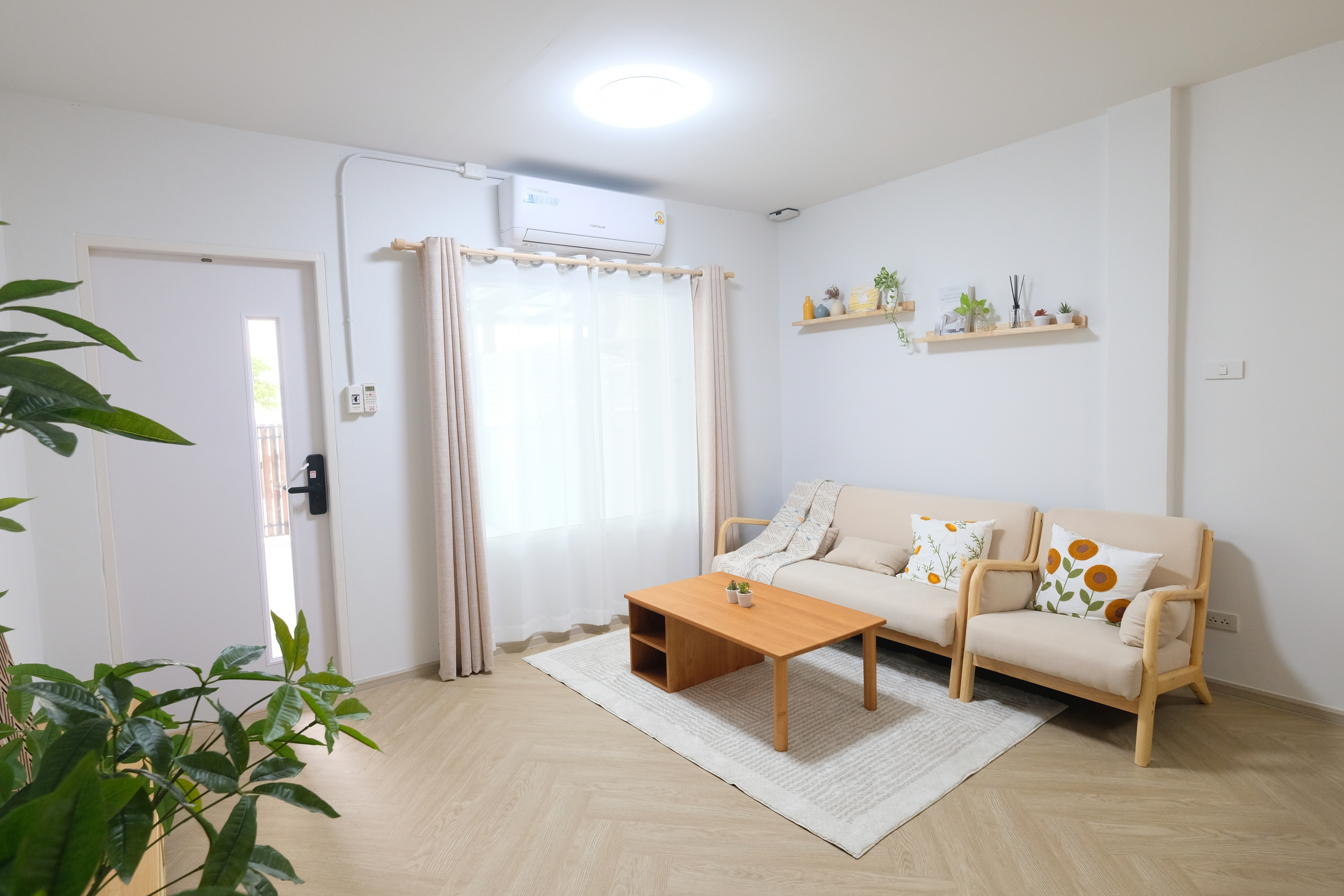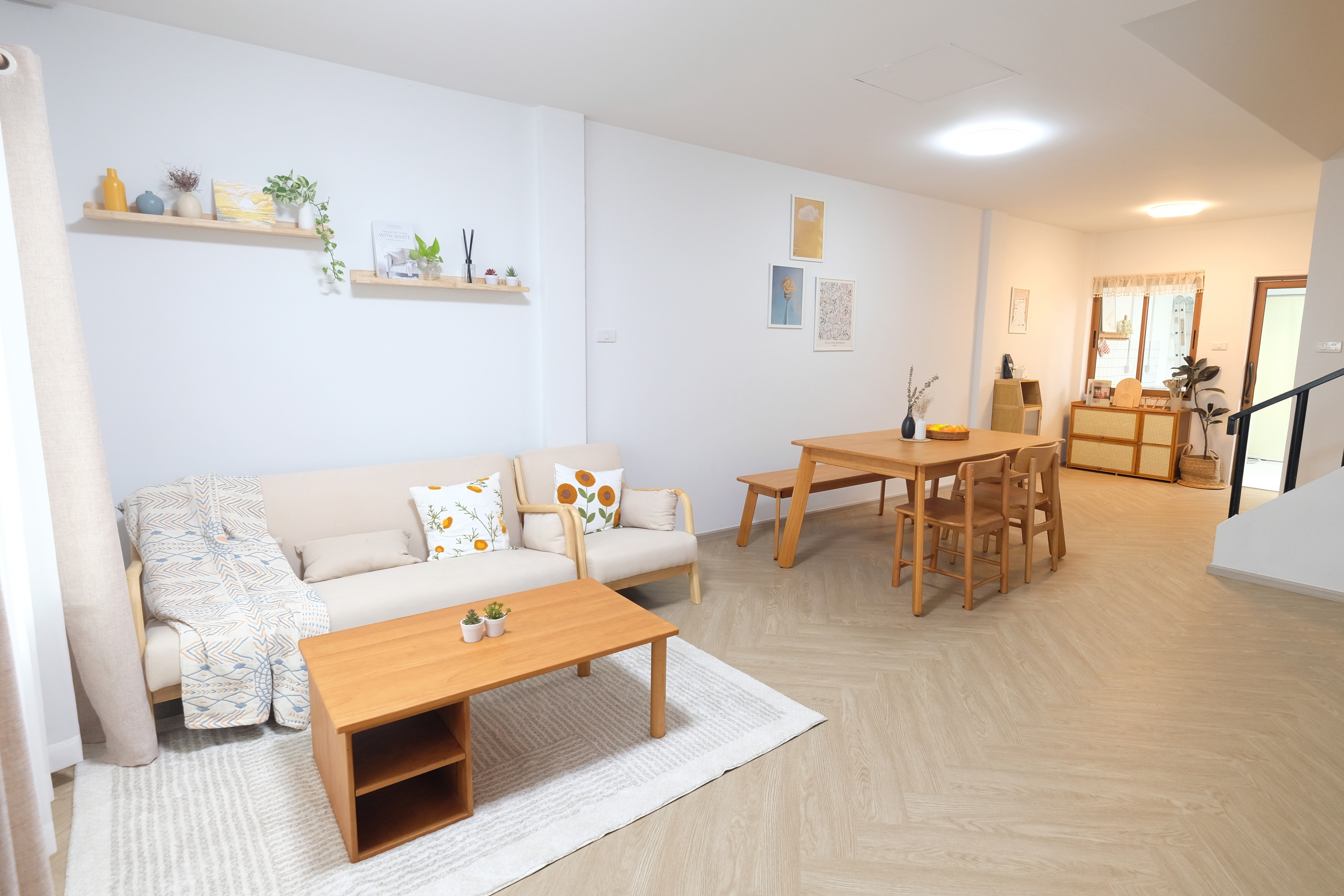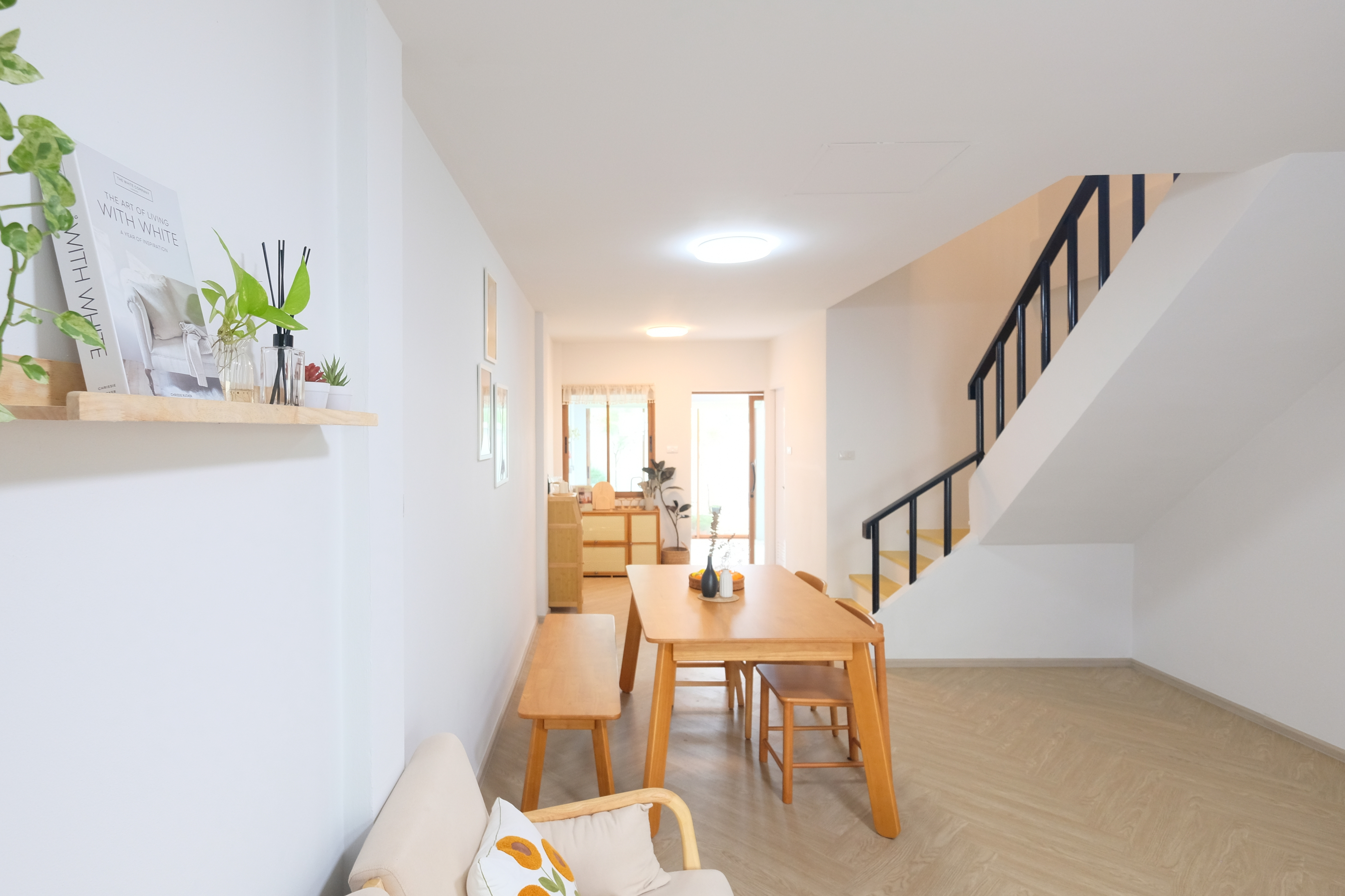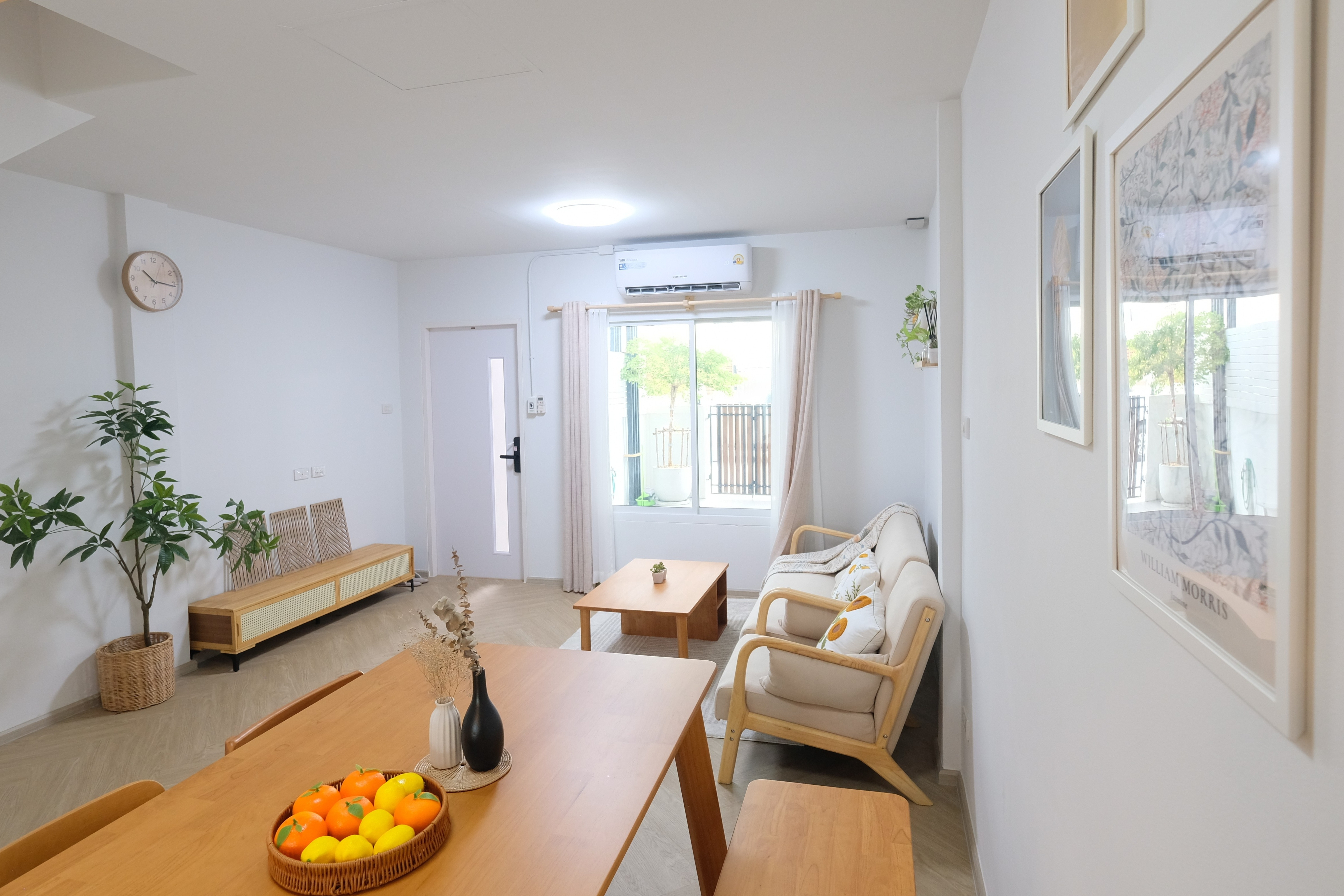 บ้านที่ตกแต่งสไตล์มินิมอล สแกนดิเนเวียน พร้อม Minimal Garden หลังบ้าน และครัวขนาดใหญ่ โปร่ง ไม่ทึบ เมื่อเปิดหน้าต่างหน้าบ้านหลังบ้าน ลมก็โฟลว์ผ่านบ้านได้ อยู่สบายไม่ต้องเปิดแอร์ (แต่ก็ติดแอร์ชั้นล่างให้แล้วนะ) แต่งครบให้ทุกอย่างที่เห็น พร้อมเข้าอยู่ทันที
