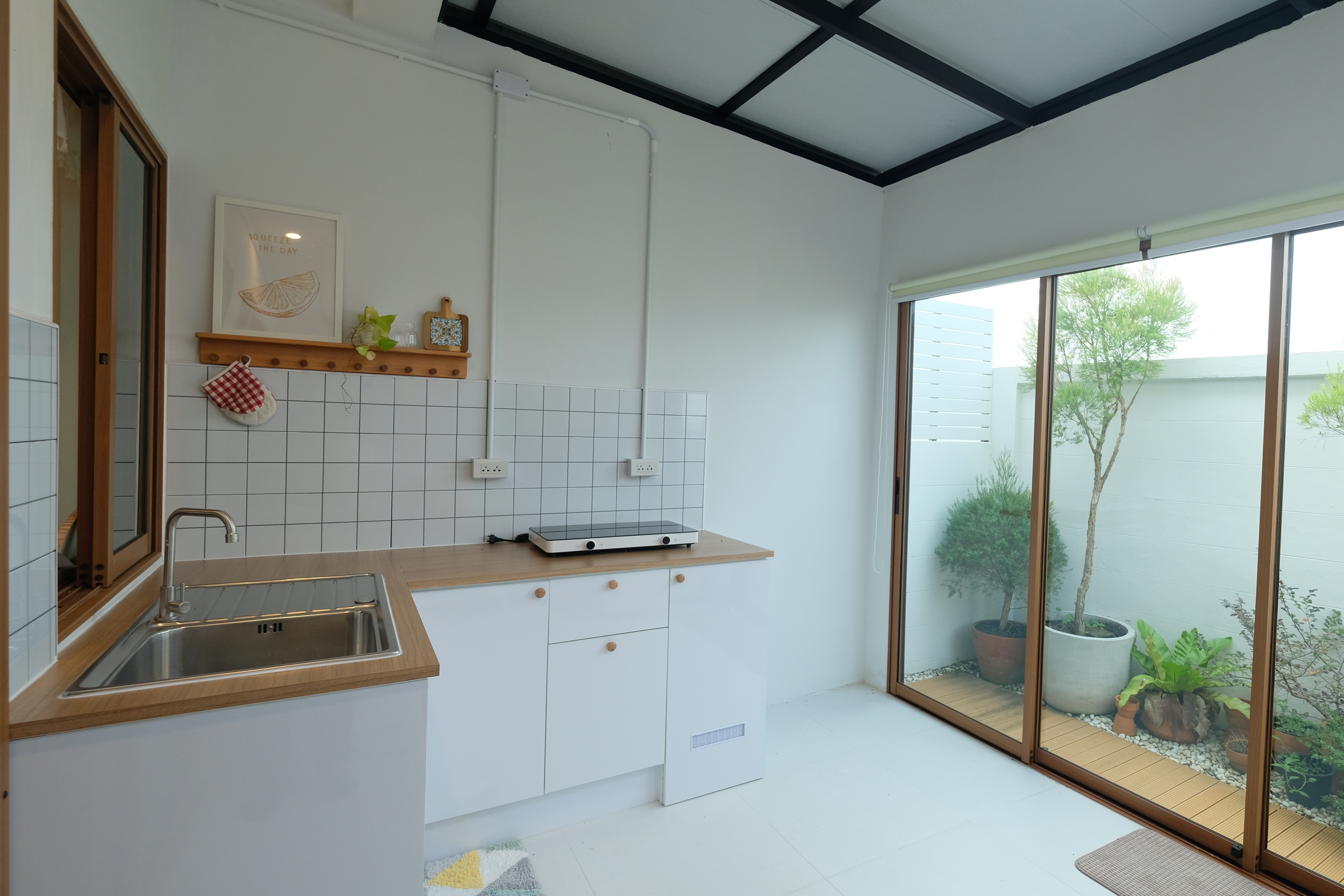 -ต่อเติมครัวหลังบ้าน ซึ่งกว้างเป็นพิเศษ ออกแบบจากการใช้งานจริง