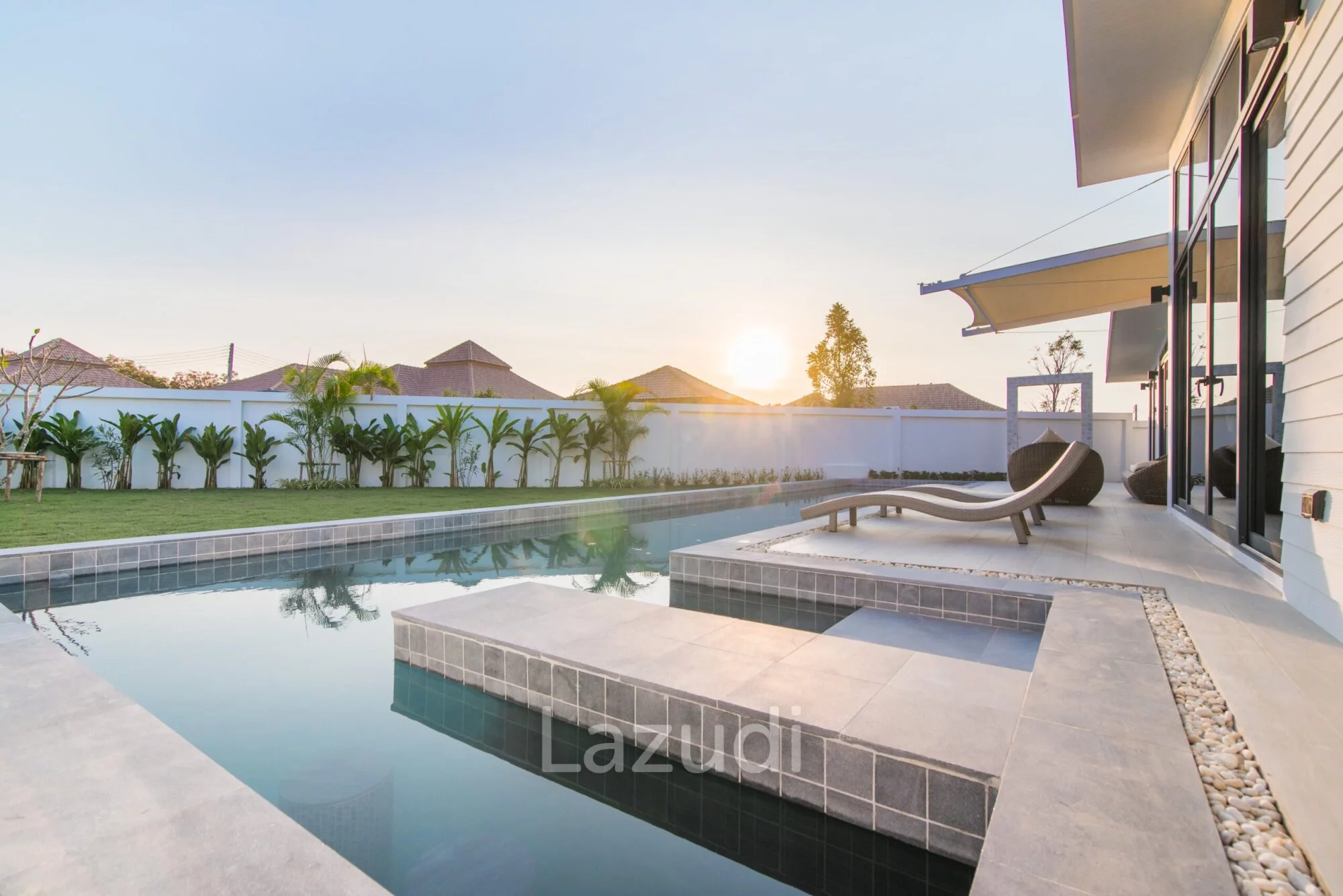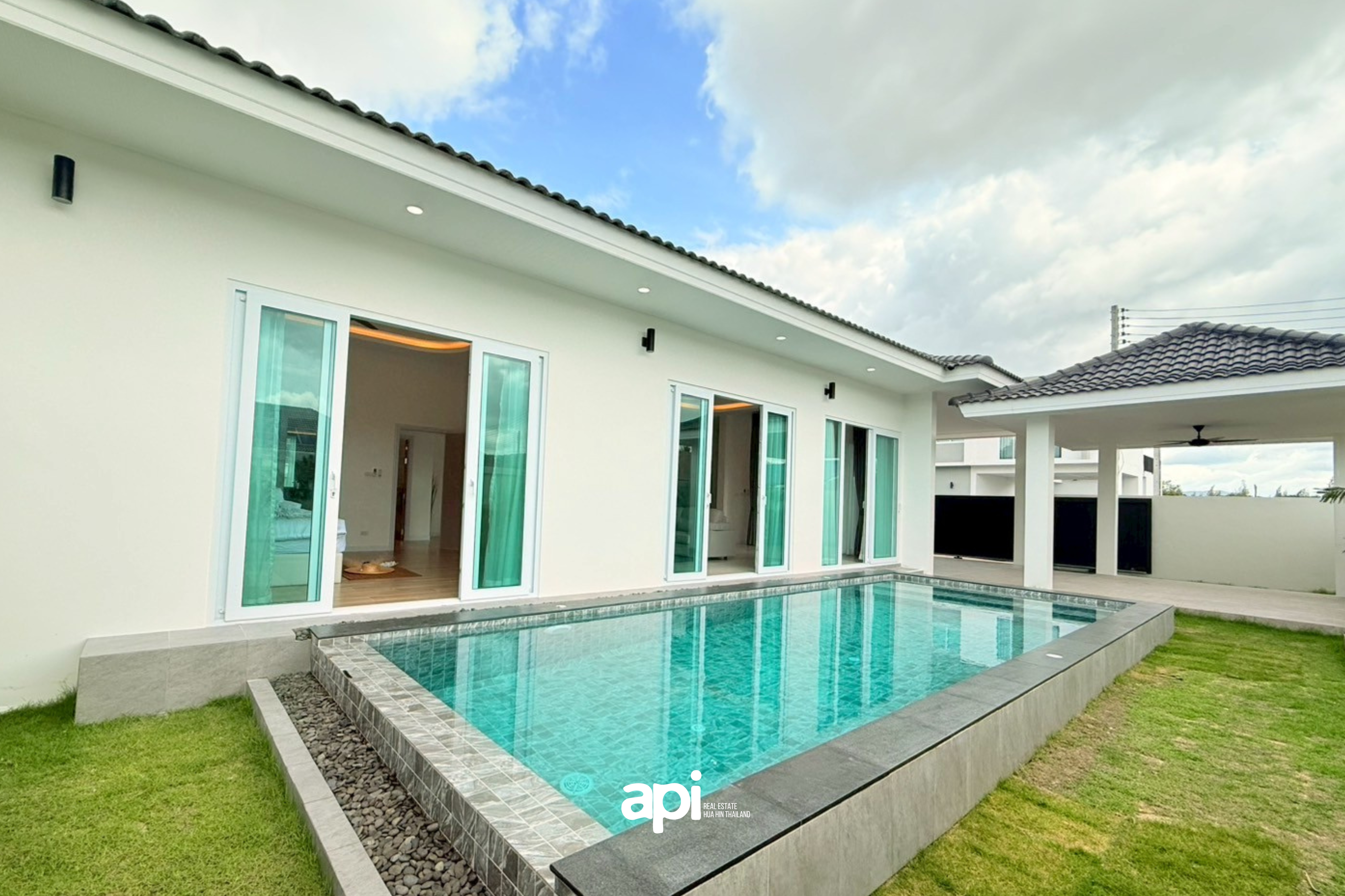 ภาษาไทย: พบกับนิยามใหม่ของการอยู่อาศัยที่เหนือระดับกับพูลวิลล่าสไตล์ Modern ทันสมัยในโครงการ Moda Tempo หัวหิน บ้านที่ออกแบบมาเพื่อตอบโจทย์ไลฟ์สไตล์คนรุ่นใหม่ด้วยเส้นสายที่เรียบง่ายแต่แฝงไปด้วยความหรูหรา พื้นที่ใช้สอยภายในถูกจัดสรรอย่างลงตัว เพดานสูงโปร่งทำให้บ้านดูสว่างและถ่ายเทอากาศได้ดี พร้อมสระว่ายน้ำส่วนตัวและระเบียงกว้างสำหรับพักผ่อน ตัวโครงการตั้งอยู่ในทำเลทับใต้ที่เงียบสงบ มอบความเป็นส่วนตัวสูงและเดินทางเข้าสู่ตัวเมืองหัวหินได้เพียงไม่กี่นาที