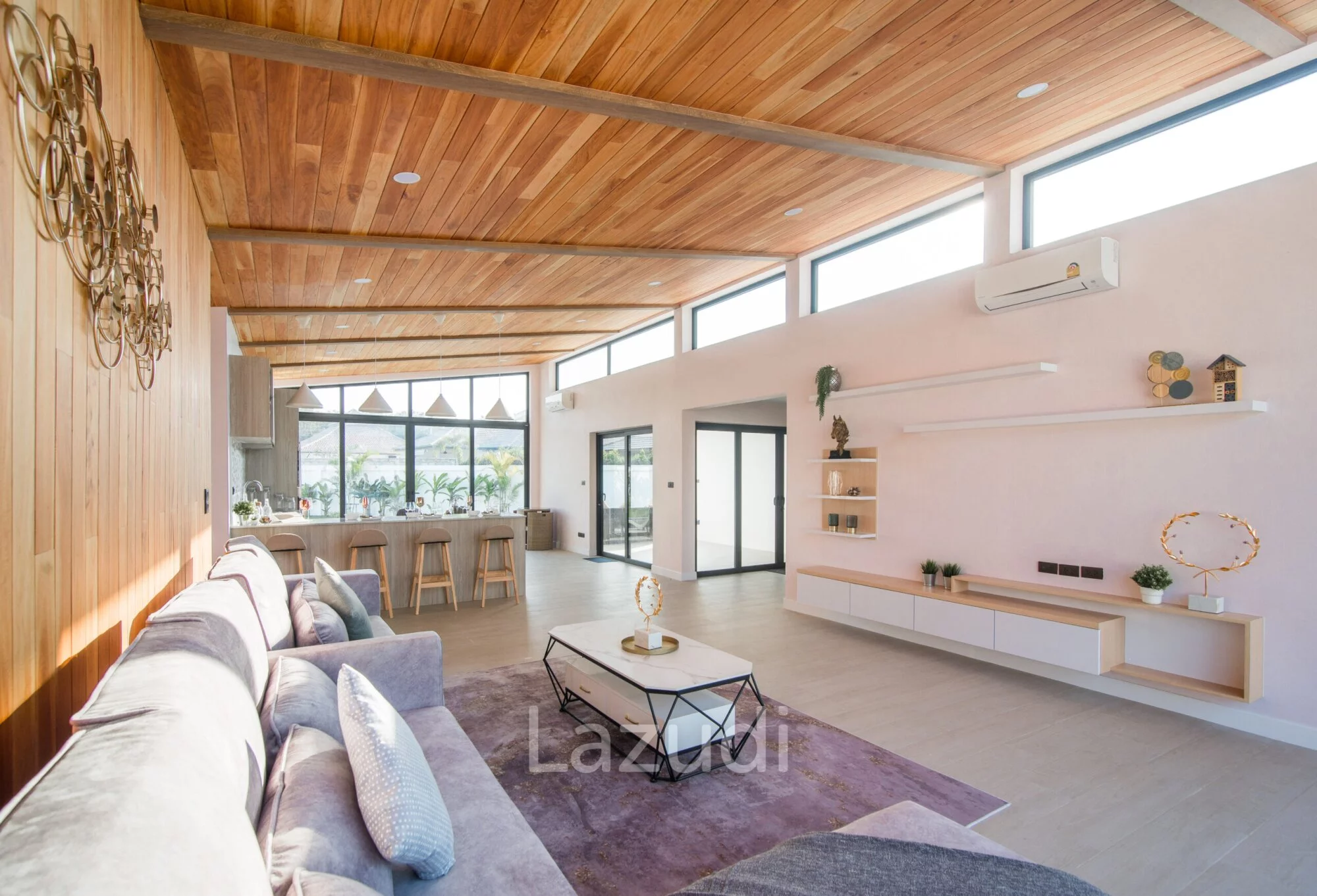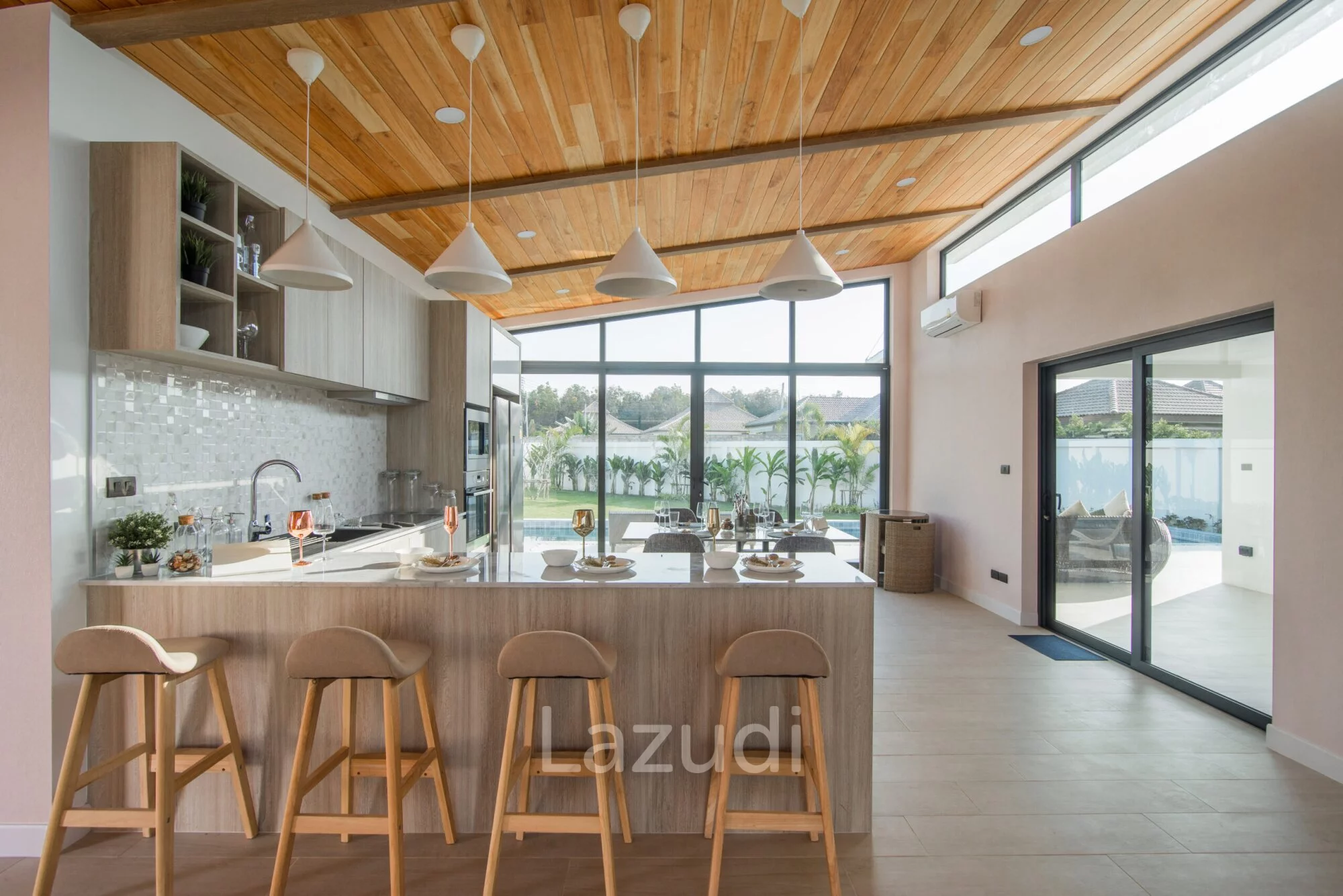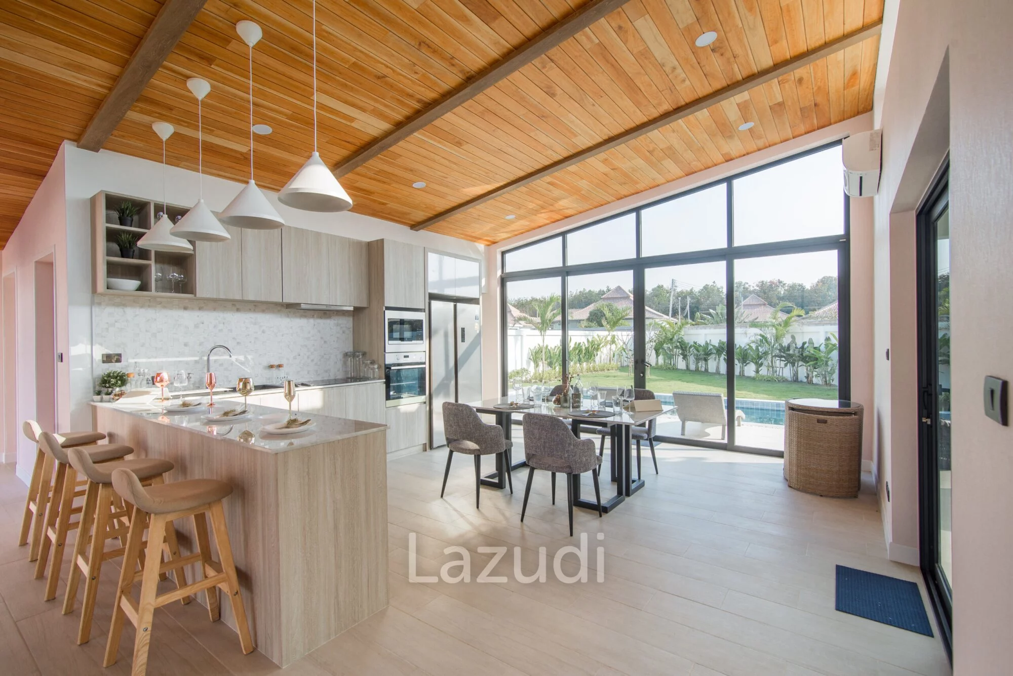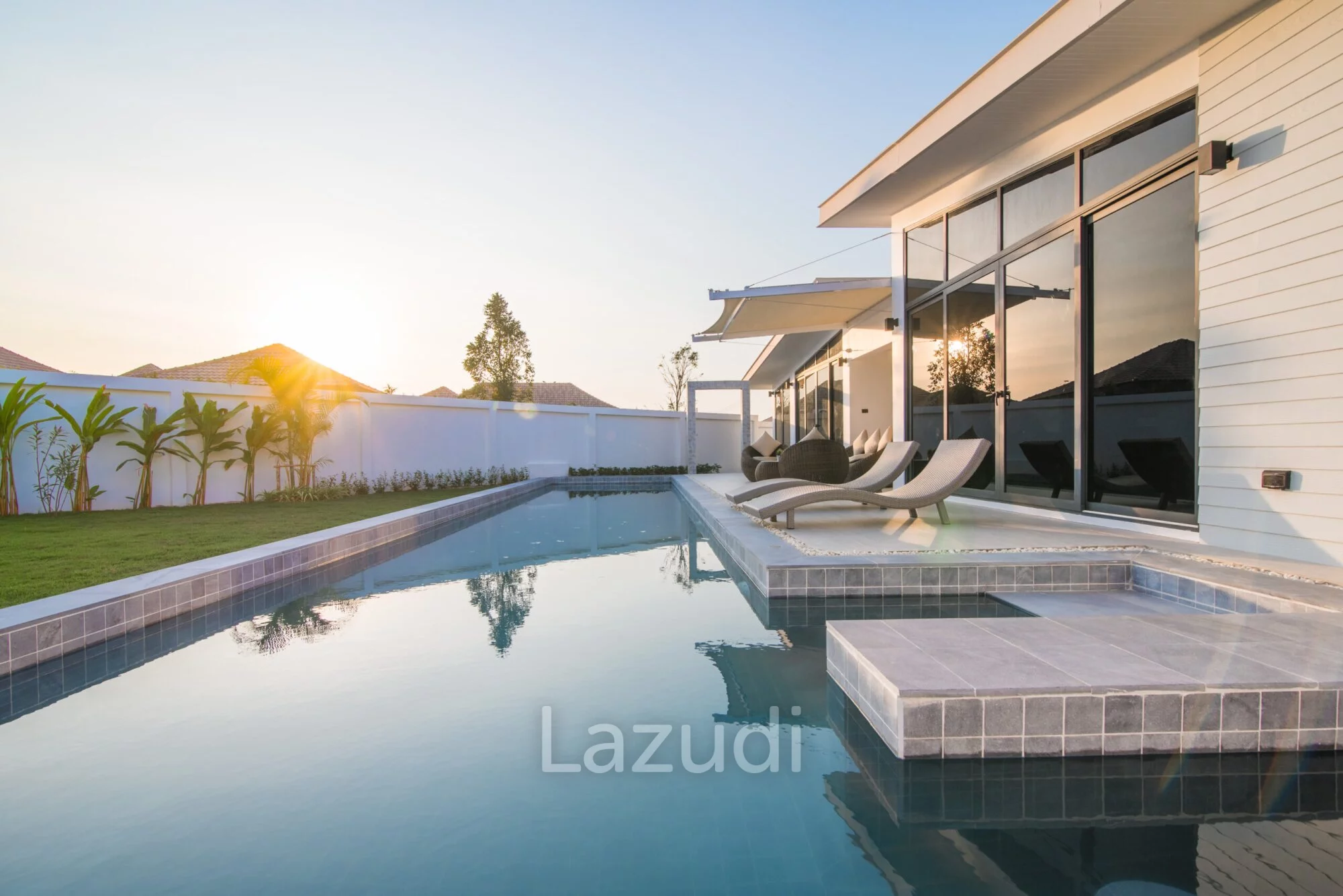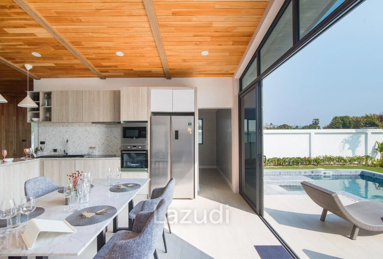 English: Experience contemporary luxury at its finest with this stunning 3-bedroom pool villa in the prestigious Moda Tempo project Hua Hin. This villa showcases a "Nice Design" with sleek architectural lines and a functional open-plan layout that emphasizes space and natural light. Every detail has been carefully curated to provide a comfortable yet sophisticated living experience. Located in the popular Thap Tai area this property offers a peaceful retreat with easy access to Hua Hin's world-class golf courses beaches and vibrant city center.