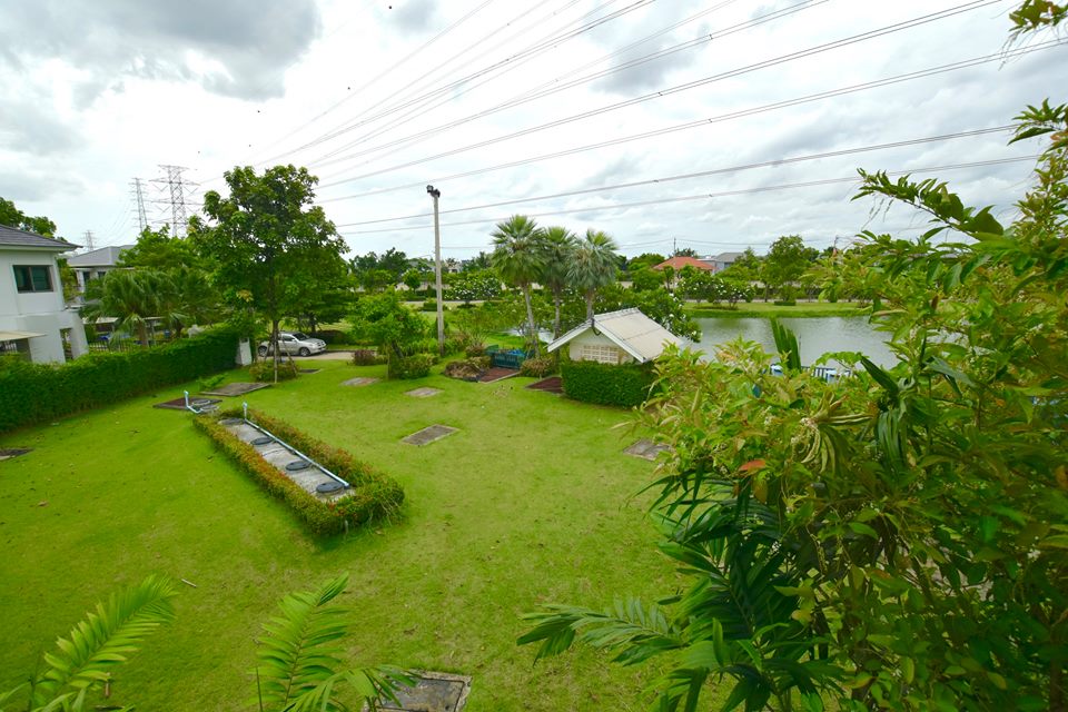 - ด้านหลังบ้านมองเห็นสวนและสระน้ำกลางหมู่บ้าน